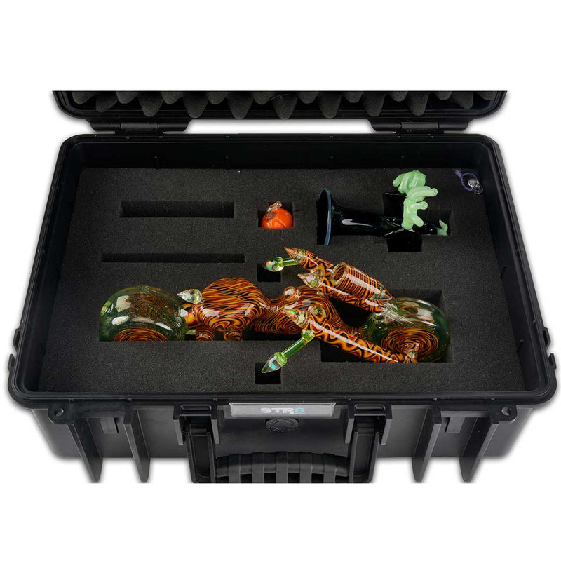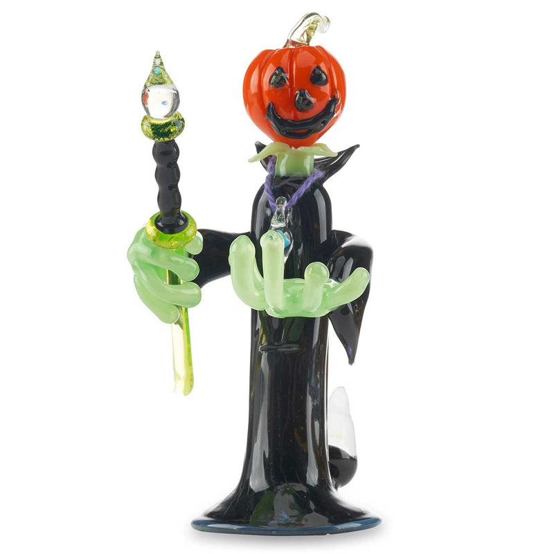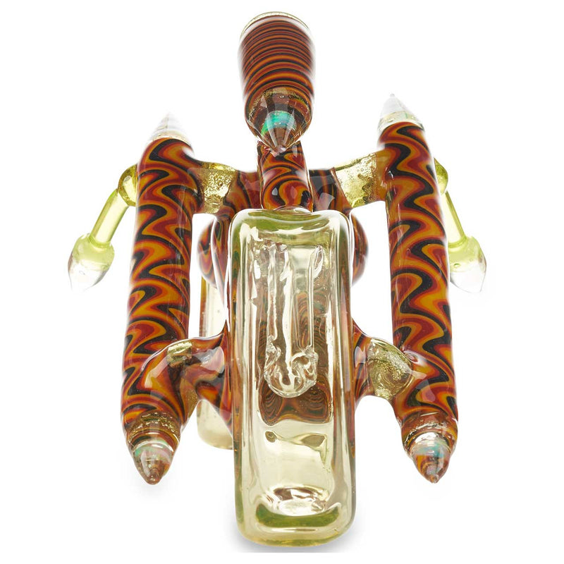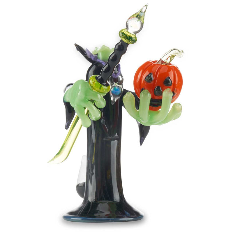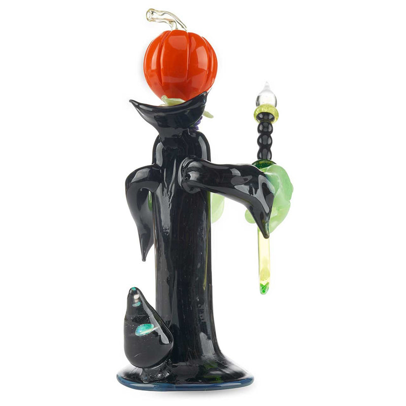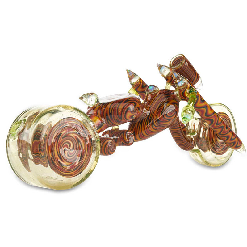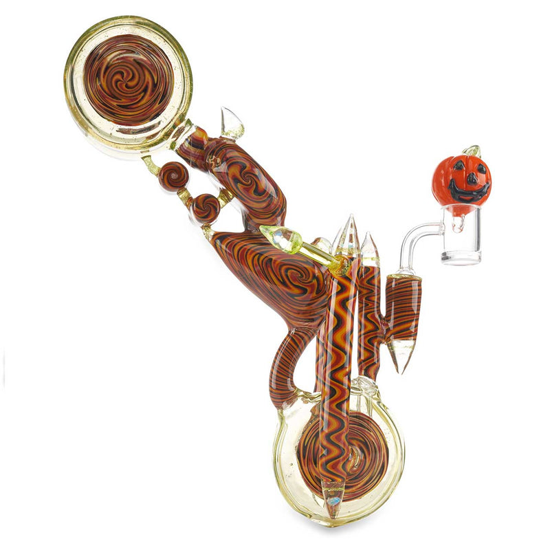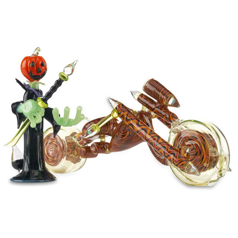 2 Dog Star has been making brilliant glass heady art for over 20 years. The one-of-a-kind 2 Dog Star dab rig features a motorbike with fully worked Illuminati wheel and accents and comes with a Pumpkin headed Horseman. This piece is more an an eye-catching, it's convesation piece that will wow anyone! If that wasn't enough, the bike also features multiple opal encasements throughout the piece. Additionally, 2 Dog Star created a horesman stand to go with this pipe. The horseman has a lava colored pumpkin for the head and slyme colored hands. The pumpkin head also doubles as a removable bubble cap that you can use. An extra bonus, is the horseman's sword that also serves as an epic dab tool. The bike rig is approximately 13" long with a female joint. Get the amazing 2 Dog Star Bike today!