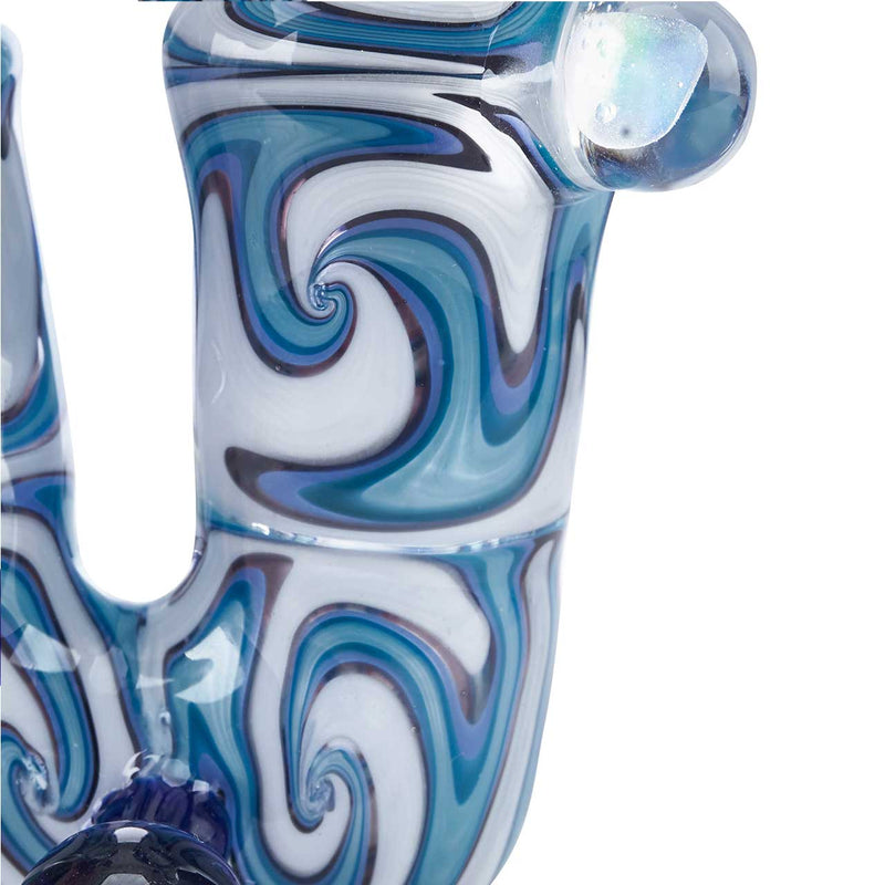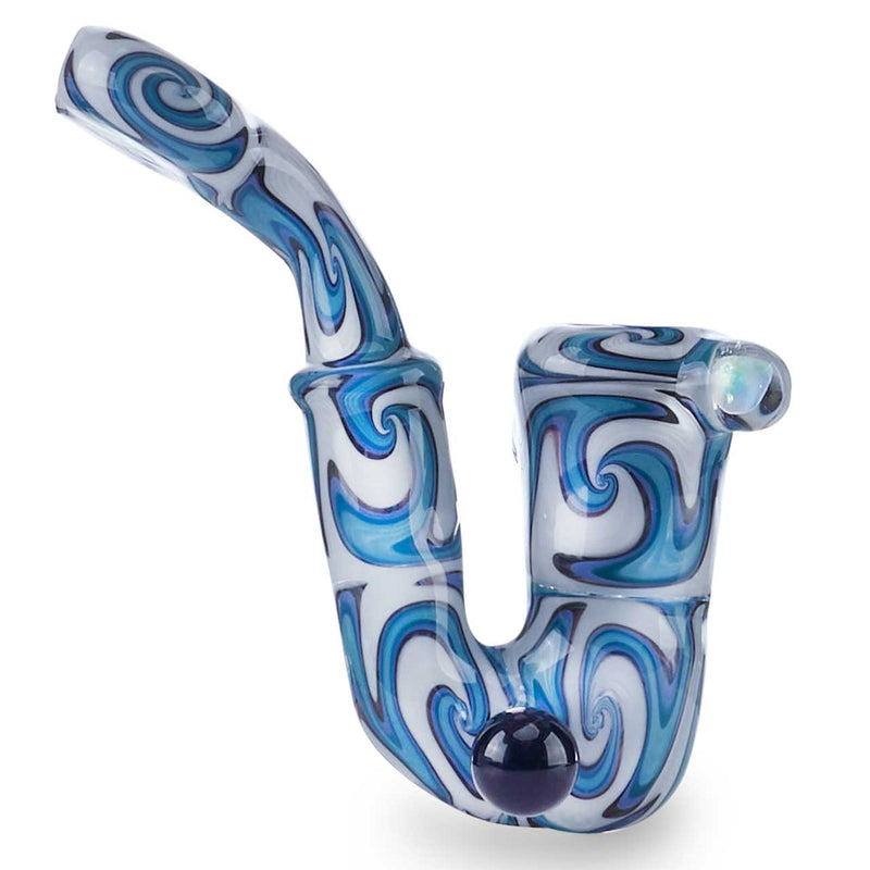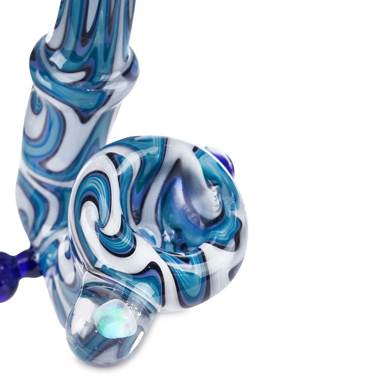 2 Dog Star has been hand-blowing amazing heady glass art for over 20 years! This Sherlock style smoking pipe features an eye-catching color combination that includes a white background and swirls of light blue, teal, and midnight blue outline throughout the pipe. Every millimeter of this Sherlock pipe is precision worked, with a full wig wag pattern that seems to swirl right before your eyes. On the bottom of each side of the hand pipe features cobalt blue marbles providing extra grip when holding the Sherlock. Additionally, there is an opal encasement on the side of the bowl opposite to the carb hole. An amazing piece for any collection, the one-of-a-kind 2 Dog Star Sherlock Smoking Pipe is bound to be your most treasured piece!