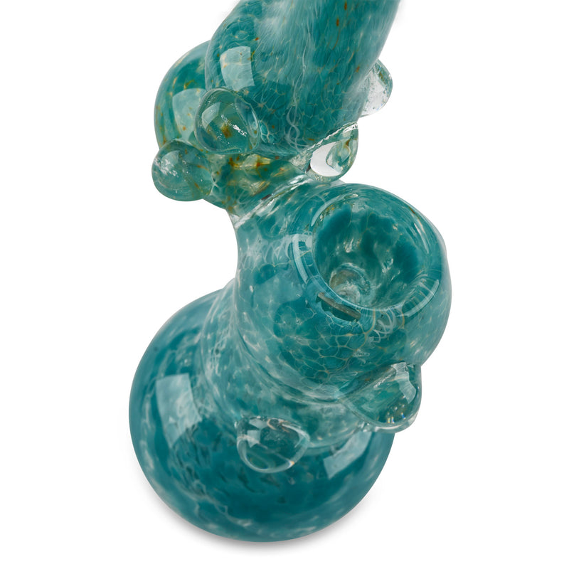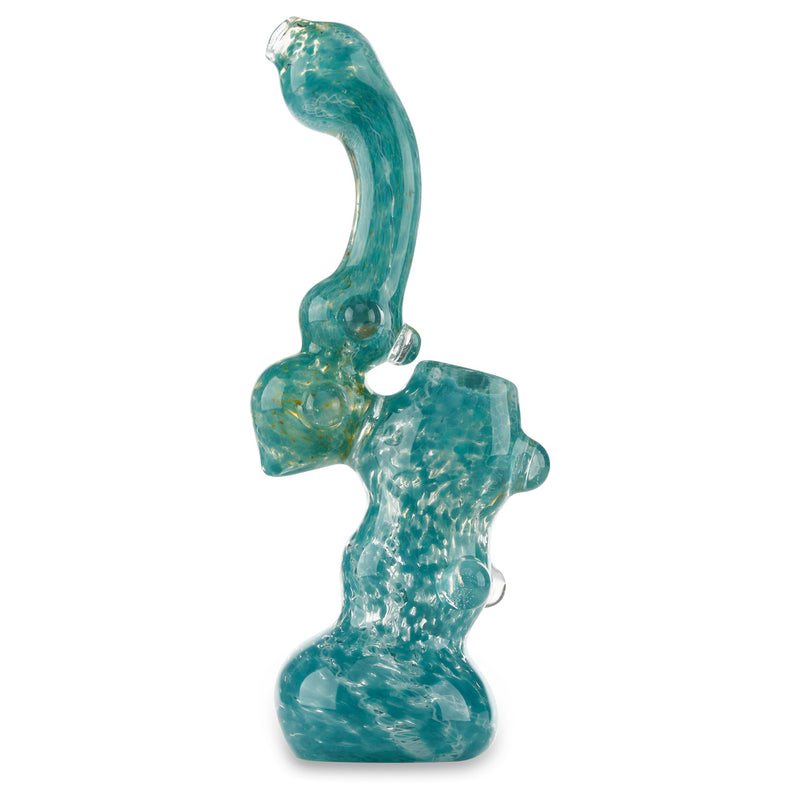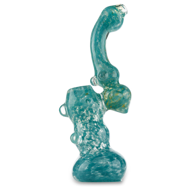 A hybrid water and dry pipe, This beautiful glass bubbler offers the best of both worlds. Featuring a large base, this glass bubbler allows increased filtration giving off a smooth, clean hit of a standard water pipe. Not only is it a beautiful design, the structure has added functionality making it easily portable with the added glass bulbs around the piece providing extra support for your hands. When you are done using it you can easily set this piece down on a table with the flattened base bottom, and never have to worry about the heat near your face as this bubbler has a curved mouth piece to keep your face away from the bowl. This collectible standing glass piece is the perfect addition to any glass collection.
