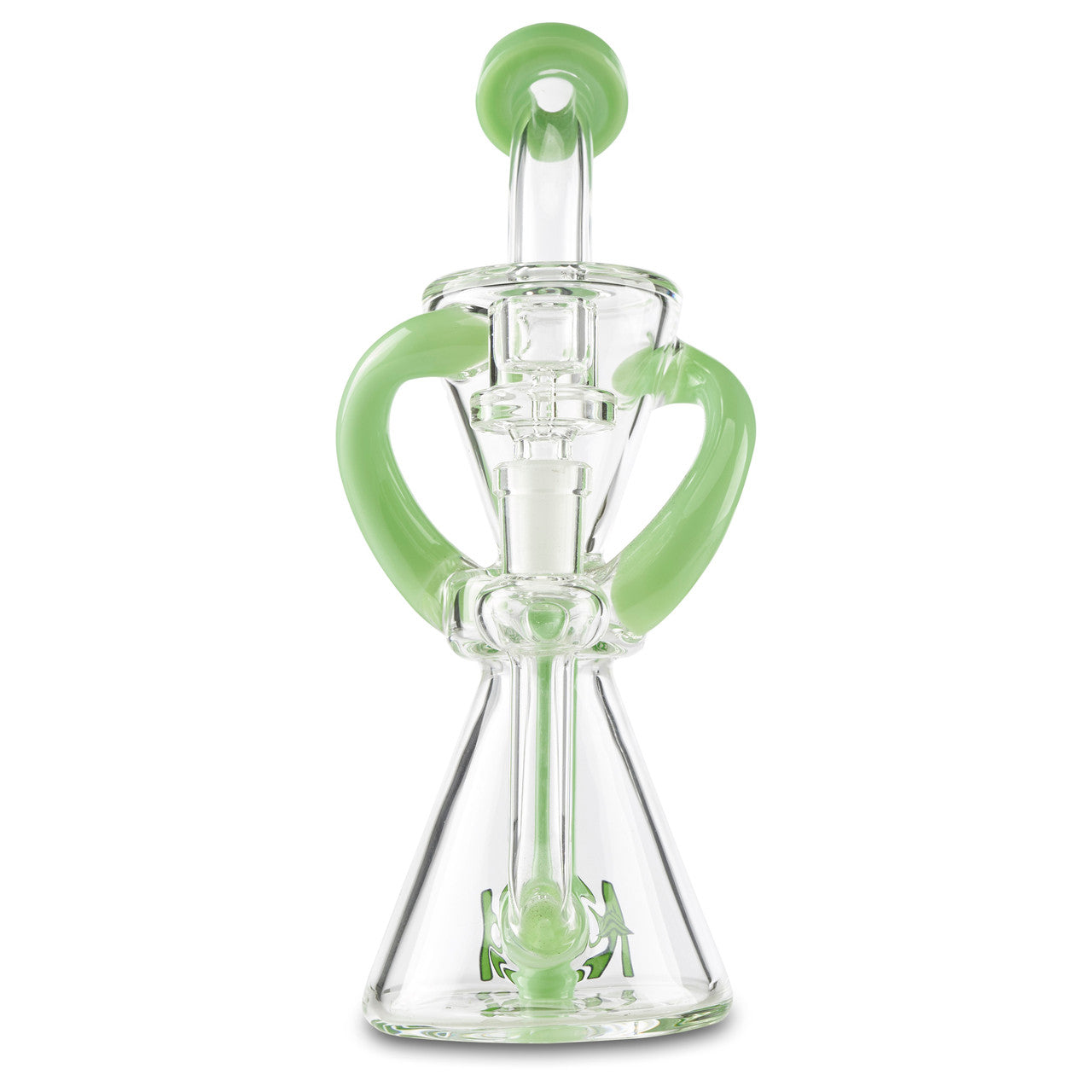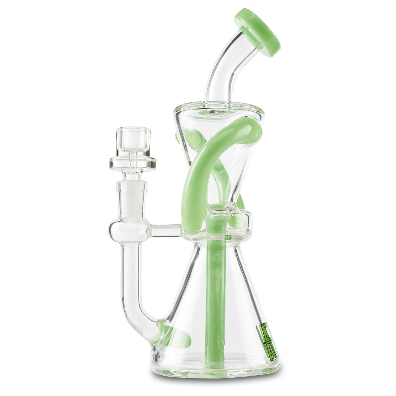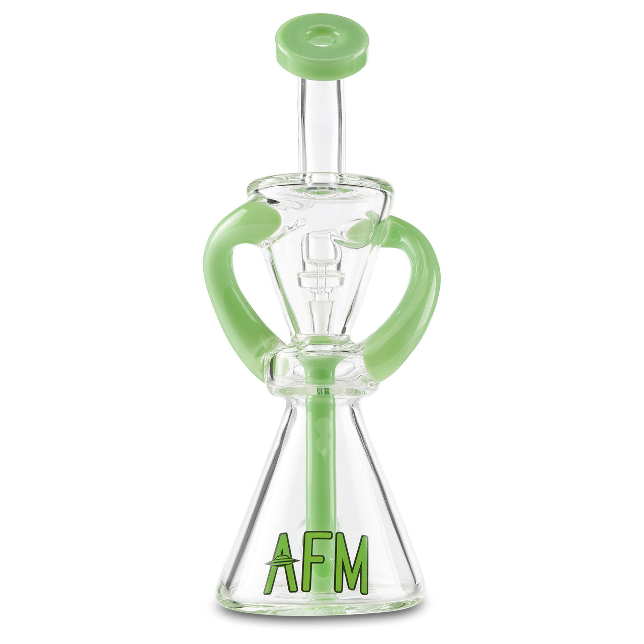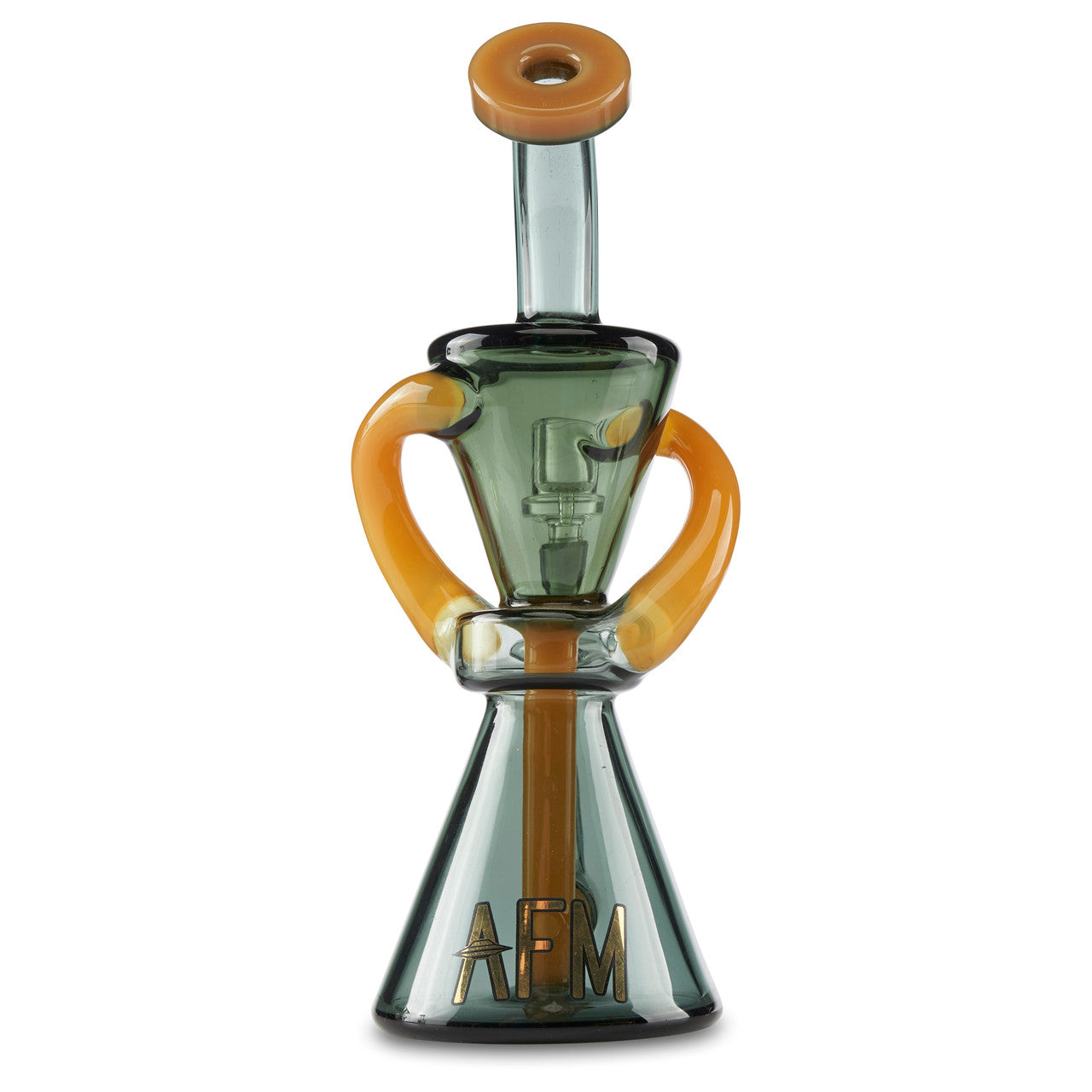 Blast off into outer space with the AFM Double Arm Recycler. This lovely recycler made by Alien Flower Monkey Glass offers fantastic performance and style. The recycler function on this piece gives you ample filtration by taking the smoke and water through the double arm tubes to the top chamber and then recycling back down to the first chamber in a swirling cyclone. The result is a cooler and smoother hit while bringing out the fantastic flavor of your concentrates. The beautiful color hourglass design featuring the colored down stem makes this piece a great, good-looking addition to any collection. Available in multiple color options.