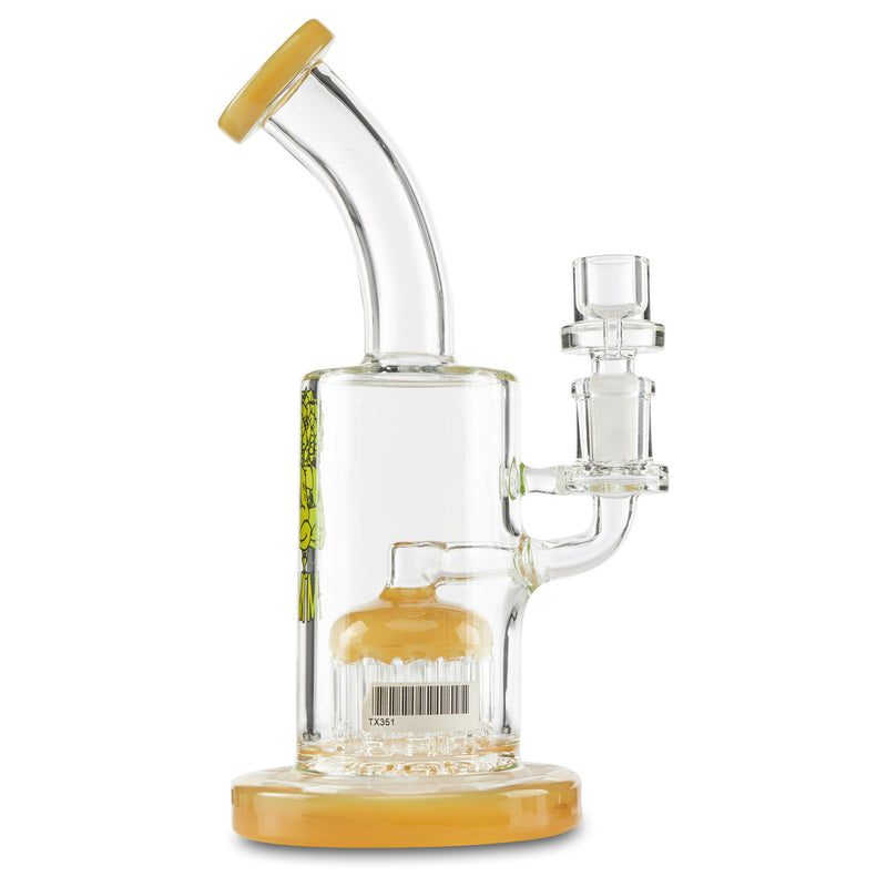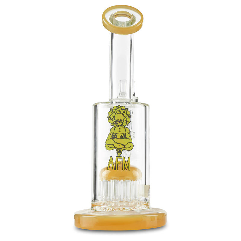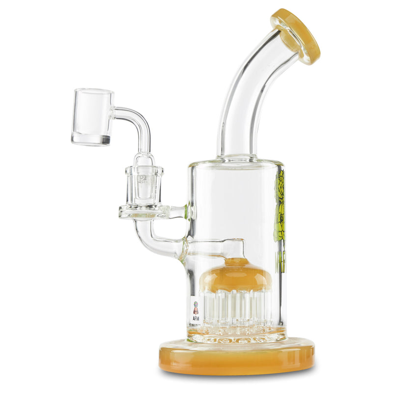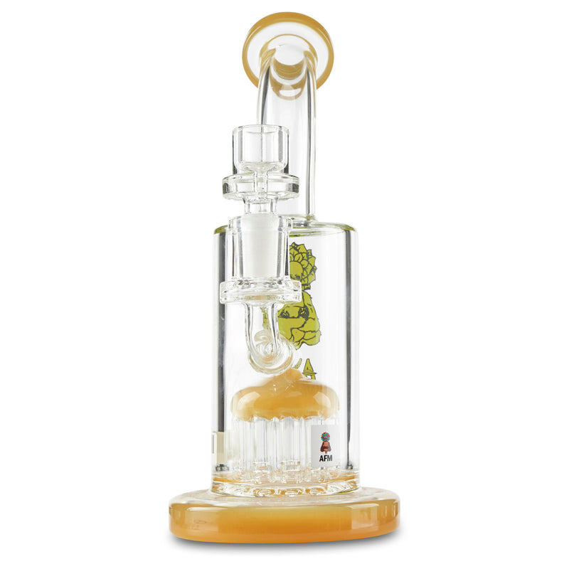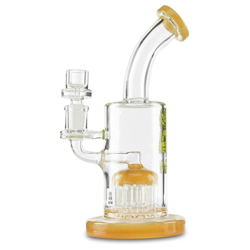 Take your concentrates to infinity and beyond with the AFM Tree Banger Hanger. This high quality dab rig designed by Alien Flower Monkey Glass features an 11 arm tree perc that takes your dabs to the next level by providing cool, smooth, and powerful hits. This rig allows you to achieve maximum filtration by forcing your smoke through the seperate rods on the perc effectively diffusing and cooling the smoke as you inhale. The bent kneck acts as a splash guard keeping water out of your mouth and your face away from the heat giving you a comfortable smoking experience. Designed with colorful accents and the awesome Alien Flower Monkey Logo, the AFM Tree Banger Hanger gives you added style without looking too busy. Enjoy the best out of your concentrates with the AFM Tree Banger Hanger Today!