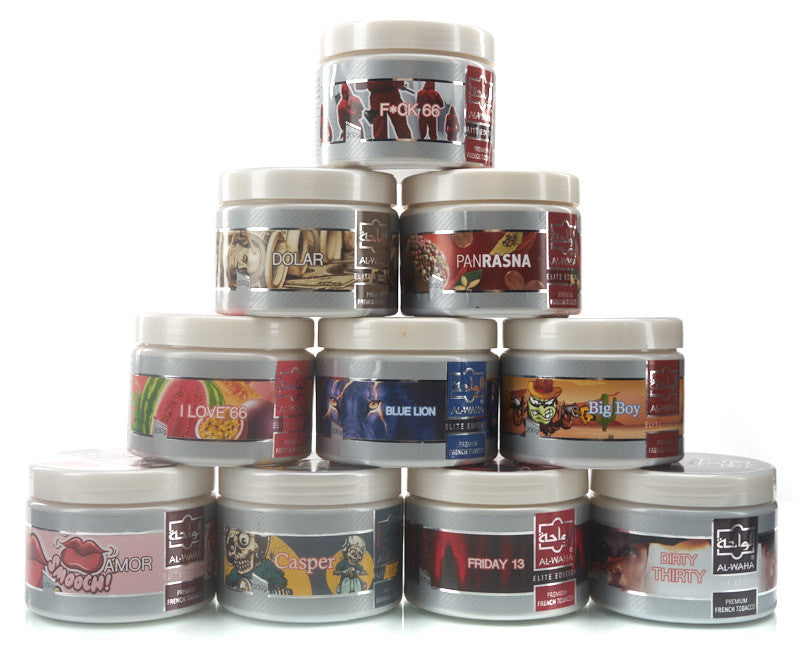 One of the largest and most popular brands of hookah tobacco is Al-Waha. Manufactured in Jordan, this premium french hookah tobacco is a common choice among all hookah enthusiasts for it's wide variety of flavors and smoothness. It consists of Premium French Tobacco leaves soaked in honey, and Al-Waha flavored tobacco is natural in color having a golden brown hue with a few flavors being dyed red and a medium cut. Typically a 200 gram jar of shisha will last for 12 to 20 hookah bowls depending on how you load the bowl.