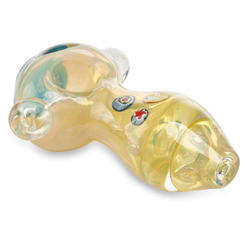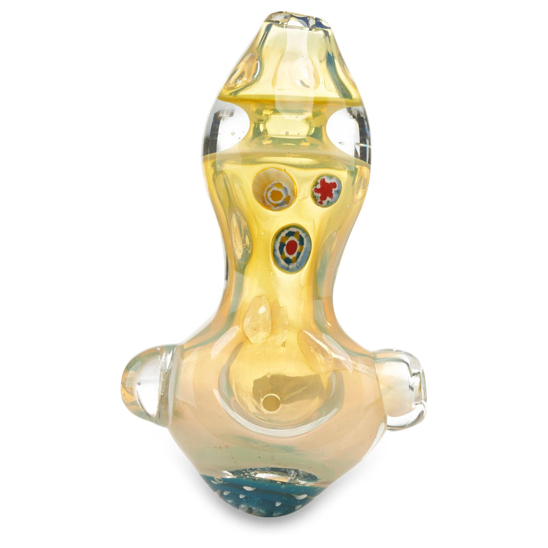 Affordability, style, and portability is everything you need in a hand pipe. The Amoeba Hand pipe is a unique borosilicate glass pipe with a compact size for on-the-go-use. This beautiful spoon pipe is designed with fumed yellow glass featuring multicolored amoeba-like designs in the mouth piece and a honey comb bubble pattern on the front of the bowl. Additionally, the hand pipe bowl has two decorative marbles that add support and grip to the hand pipe. With the affordable price, the Amoeba Hand Pipe is a great, unique piece for your collection.