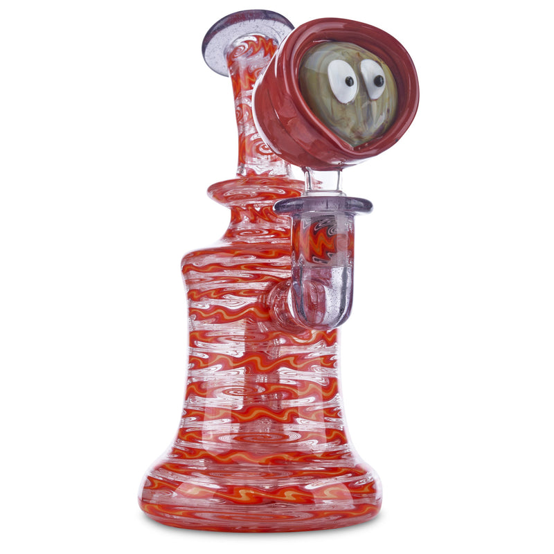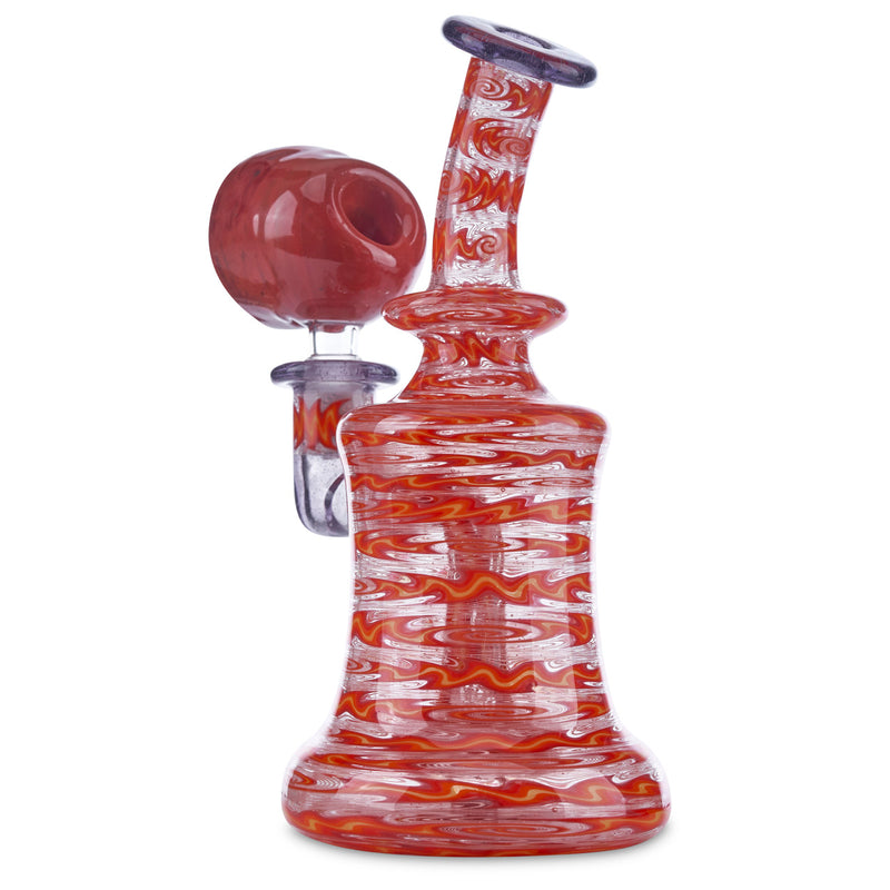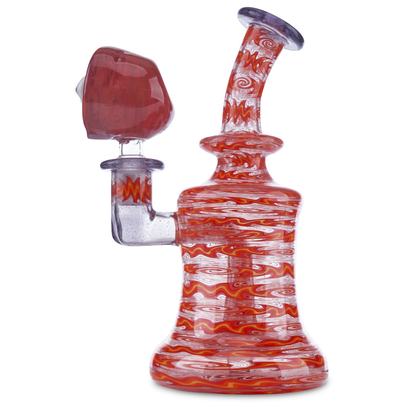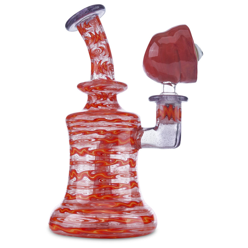 Andy G is an amazing artist showcasing his incredible talent with his out of this world linework and color featured in his glass designs. This Banger Hanger by Andy G displays immaculate attention to detail with the hot sauce wig wag work throughout the pipe featuring purple rain on the lip rim and joint of the rig. This banger hanger is designed with a 14mm female joint at a 90 degree angle.