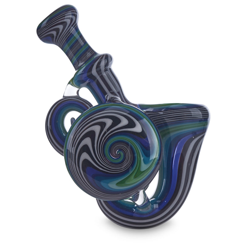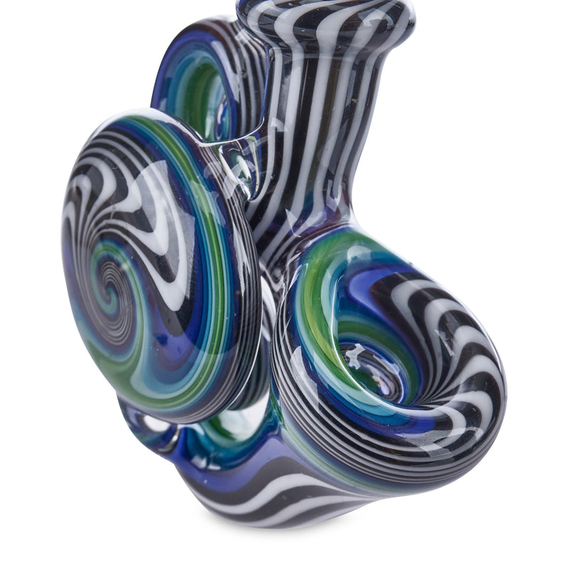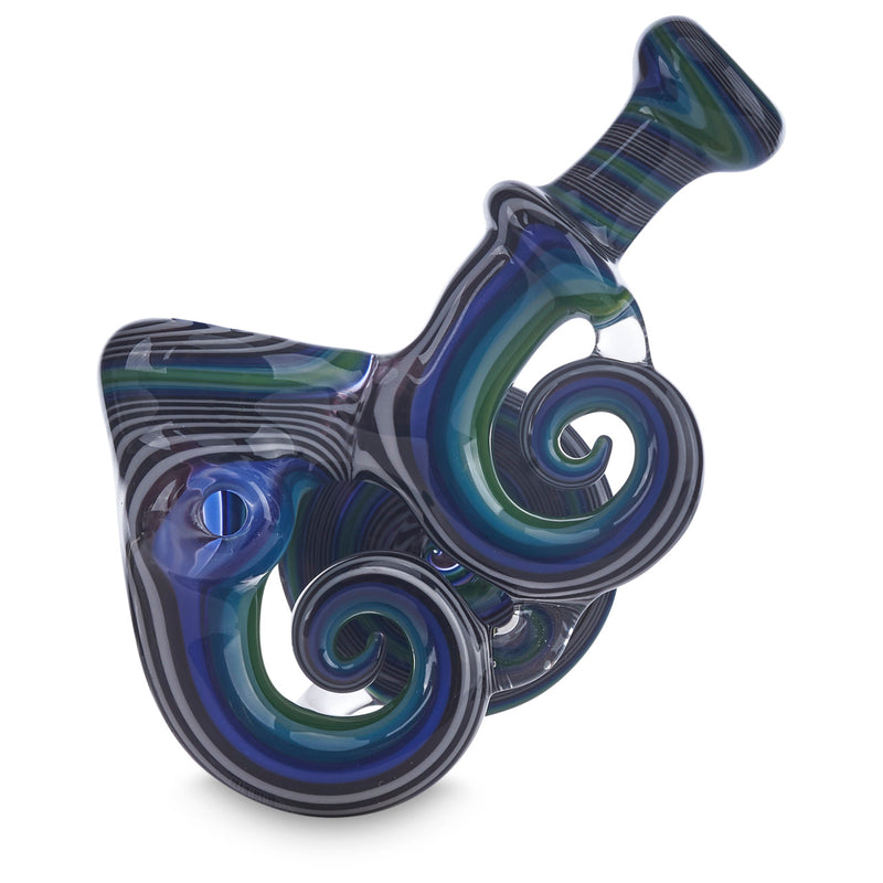 Andy G's work will dazzle your eyes with the immaculate line work and amazing use of color in all of his pieces. This beautiful sherlock displays Andy G's attention to detail with the jailhouse, blue, and green linework throughout the pipe. This amazing sherlock also features two horns on the side of the pipe with a matching wig wag cab on the opposite side. Get it today at Cloud 9 Smoke Co.