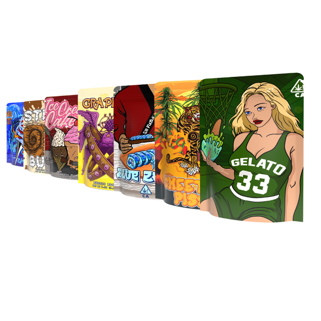 5× 3.5 g mylar pouches (flat, with tear notches, zip closure, and hang hole)