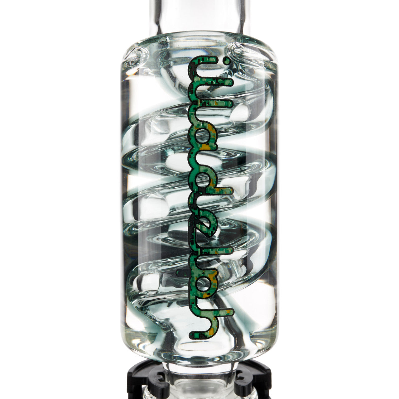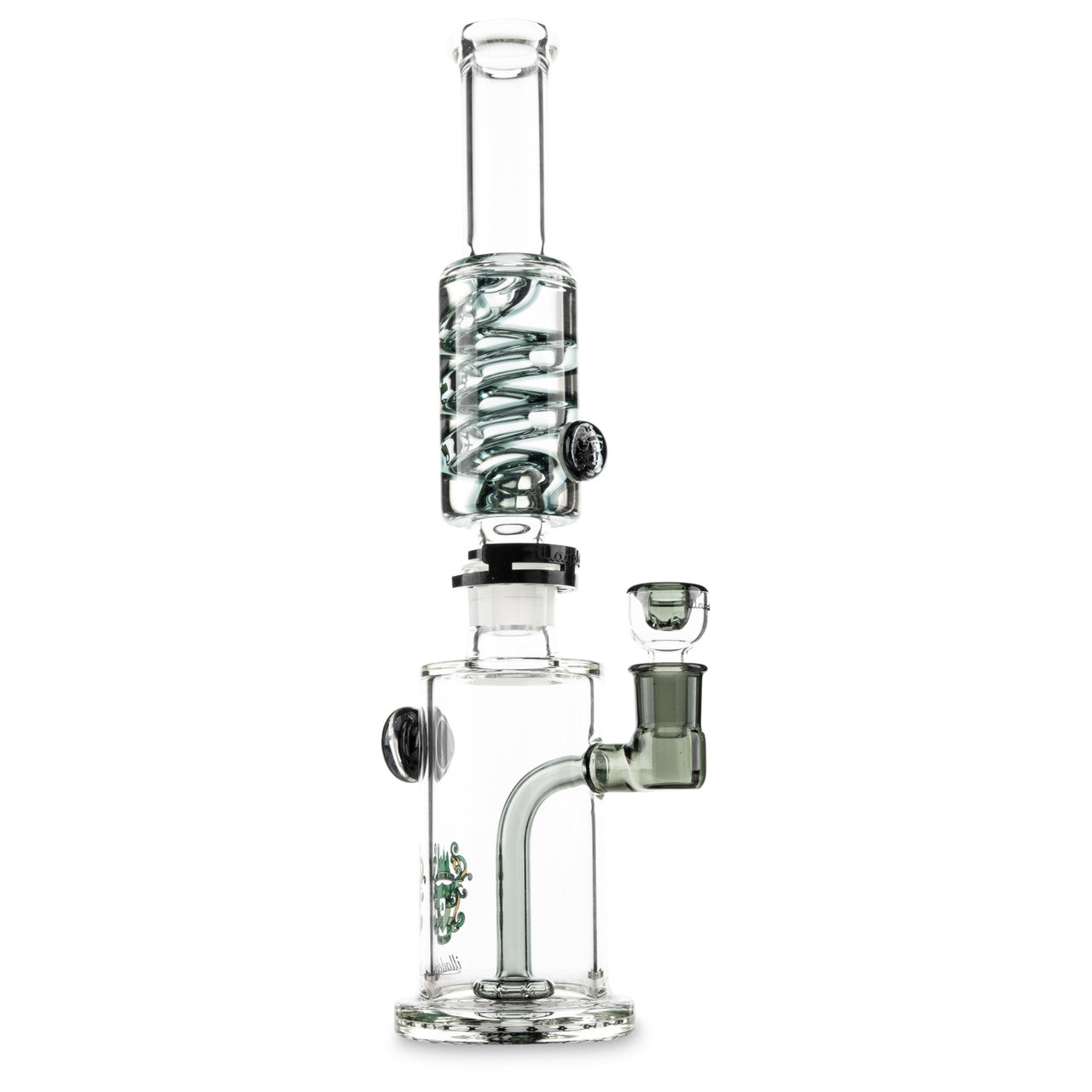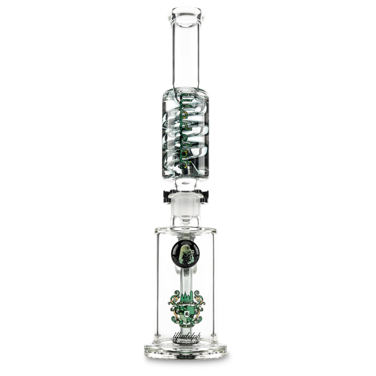 Illadelph Glass is always producing the best high-end scientific glass on the market. The Illadelph Bendanklin Fixed Stem Freeze Coil is a collab with the popular Benjamin Danklin brand. This straight tube towers at approx. 14" tall with a detachable glycerin freeze coil. The glycerin retains a higher freeze point that keeps your smoke ice-cold longer than water. All you have to do is pop the freeze coil in your freezer a few hours before use to enjoy a nice cold smoking experience. This piece features a charcoal color freeze coil, joint, downstem, and bowl. Additionally, you can find a dope ben danklin pendant attached to the front and back of the piece. The Illadelph Signature logo has a green and orange camo design. Get the Bendanklin Fixed Stem Freeze Coil Today!