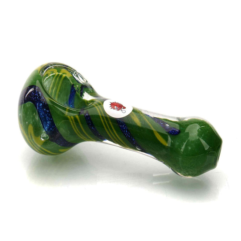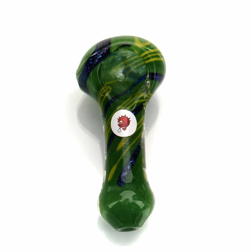 Though the Blowfish Glass Hand Pipe may seem like a tiny contender to have in your glass collection, don't let looks deceive you! This compact water pipe is full of accents and functionalities that will elevate your smoking experience to outstanding heights. The Blowfish Glass Hand Pipe is a compact hand pipe crafted from borosilicate glass with extremely smooth architecture! This spoon styled hand pipe features an insanely wide and deep bowl meant for dense, by that we mean fat, packing for prestigious smoking experiences. As you smoke from the Blowfish Glass Hand Pipe, you can use its carb hole to have direct control of every hit from this piece to creat a smoke sesh that is genuinely yours! The body of the Blowfish Glass Hand Pipe is outfitted with swirls of solid yellow and dichroic blue cane, making this a sight for sore eyes. When a glass blower uses dichroic elements in their pieces, they're stacking layers of glass or metals for a piece to take on a sparkling, color changing appearance. It's no doubt that the design and functionality of the Blowfish Glass Hand Pipe cannot be turned own!