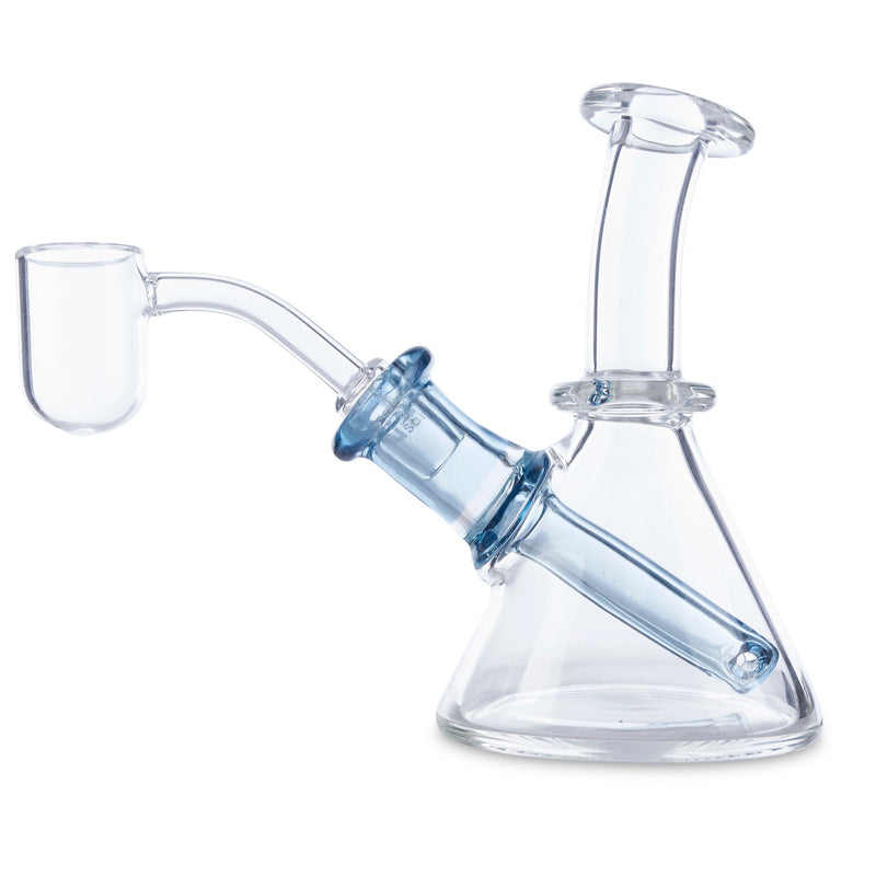 Tyler Bowman, founder of Bowman Glass, is based out of Portland, Oregon. He is well-known for his window tubes and figure sculpting. All of his pieces are sturdy, well-shaped, and beautifully crafted. This mini tube by Bowman Glass features clear glass with an aqua azul joint and downstem. The Bowman Mini tube has a 10mm female joint at a 45 degree angle.