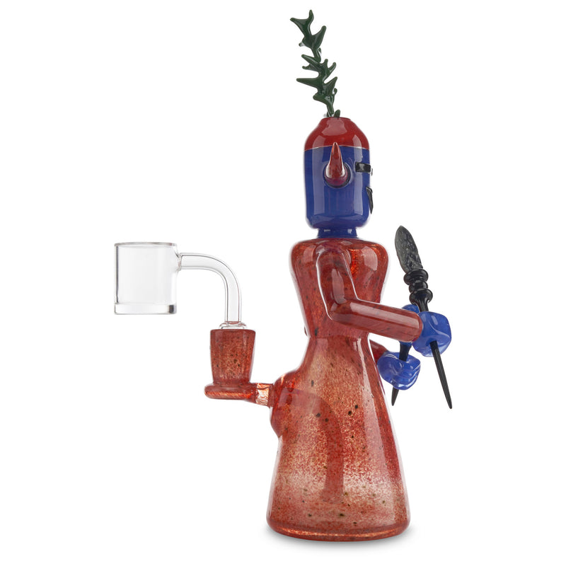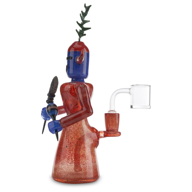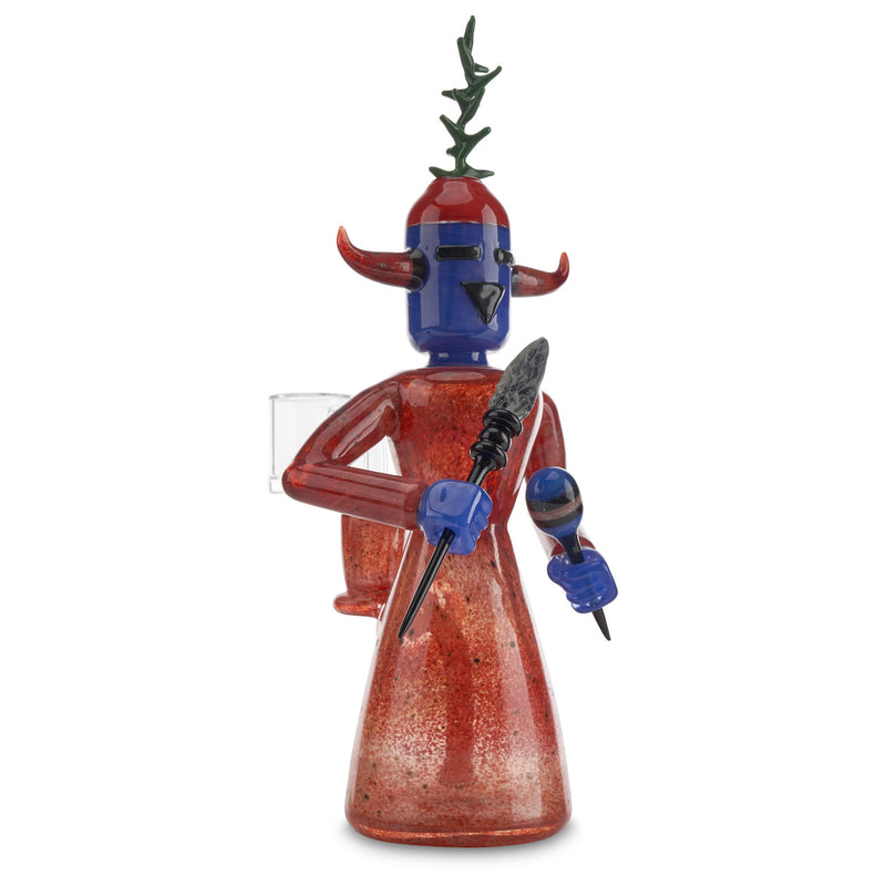 Brain Jacobson is a legendary glass artist from Tucson, Arizona. His rigs are absolutely stunning works of art with great functionality. This Kachina Doll rig is truly magnificent. The Kachina Doll is a native american cultural tradition. They were initially carved from a single piece of wood and used as a teaching tool to help children learn and preserve their history and spiritual significance. This gorgeous kachina sculpture rig is designed with red frit glass as the robe, horns, and mouthpiece. The face and hands are designed with a gorgeous iris color. The arrowhead and moracca that the doll is holding in it's hands are removable and able to be used as a dab tool. This amazing rig stands at approximately 7.5 inches tall.