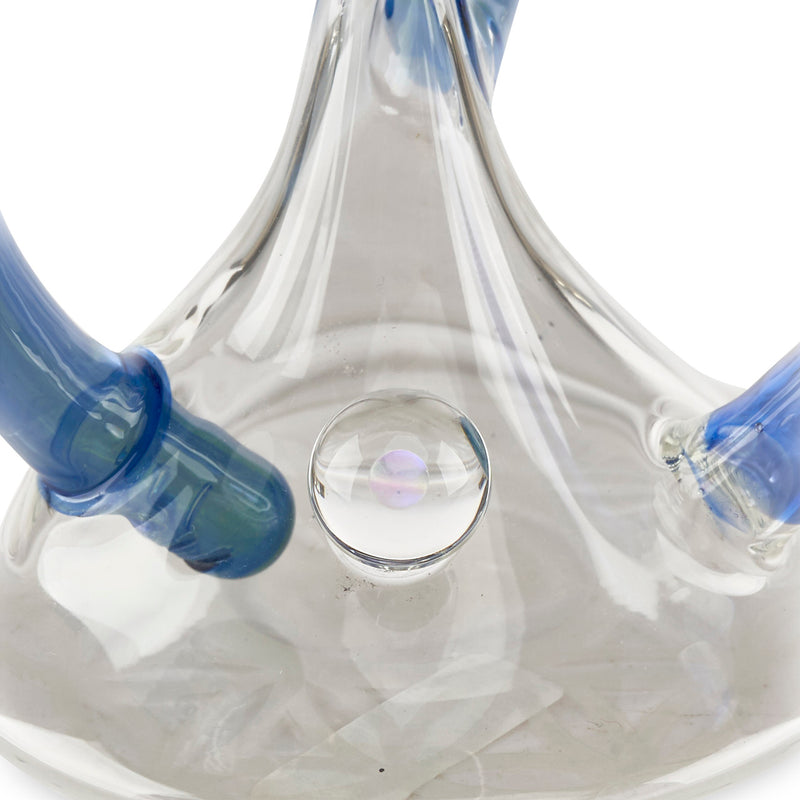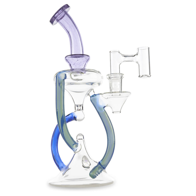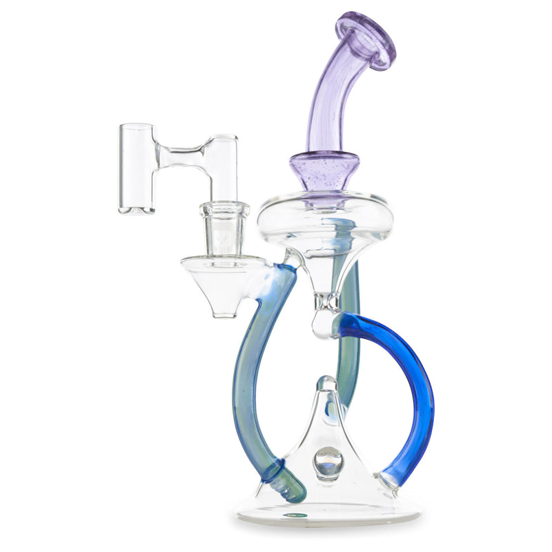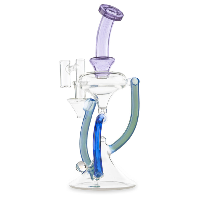 Casa Glass is a Texas glass artist and since 2012 has produced amazing glass pieces. Casa Glass started off by hand-blowing pieces out of the back of a smoke shop that him and his brother started. Over the years, their passion and hard work has paid off by becoming renown artists in the industry. This beautiful recycler clearly demonstrates Casa Glass's quality craftsmanship with the unique design of this recycler. This Casa recycler is a floating recycler with blue and purple arms that connect the two chambers. Additionally, this piece has an opal encasement on the base. The Casa Floating recycler stands at 8.75" tall with a 14mm female joint.