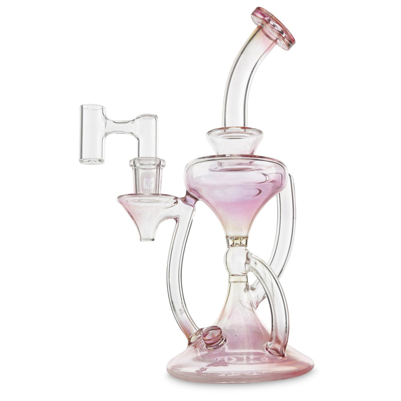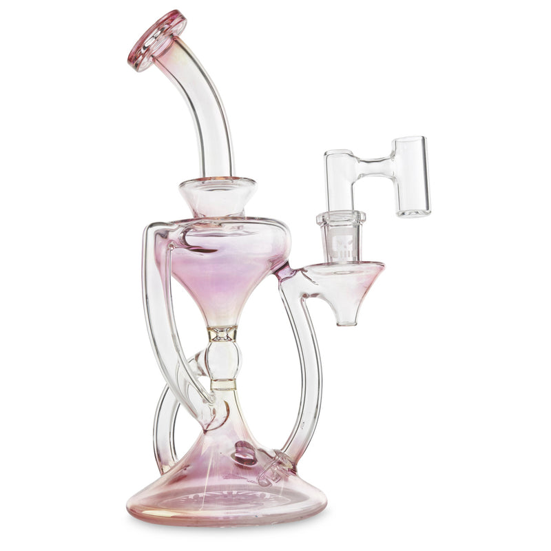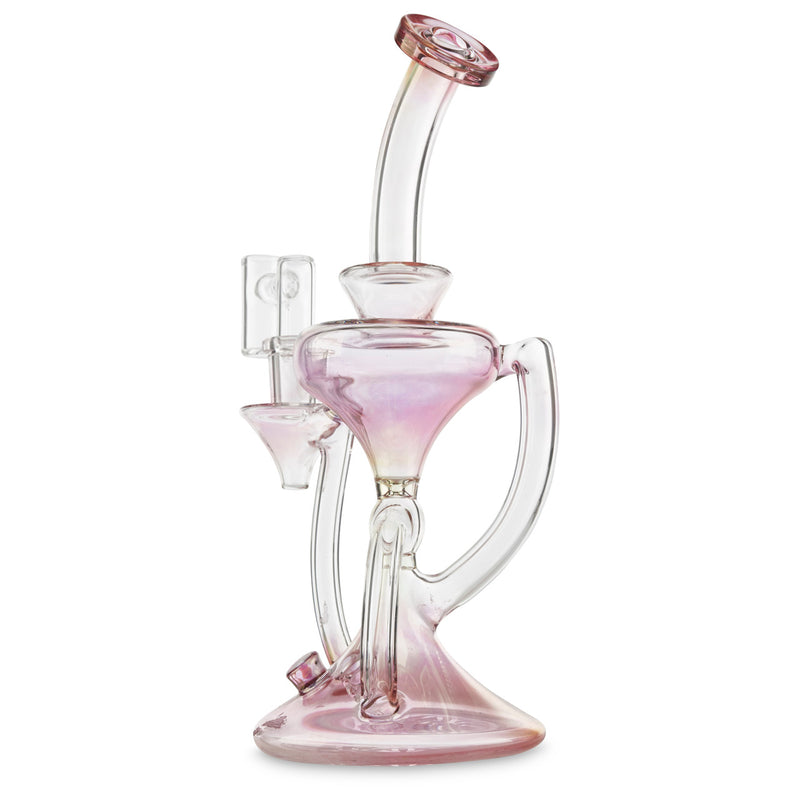 Casa Glass has been producing amazing recyclers since 2012. This beautiful hourglass recycler is designed with a pink fume throughout the body of the pipe and on the lip rim. The base of the recycler is detailed with a signature opal encasement. The bent neck mouthpiece on this glass pipe acts as a splash guard keeping the water out of your mouth. The recycler includes the Casa Glass 14mm banger providing everything you need to enjoy your concentrates right away.