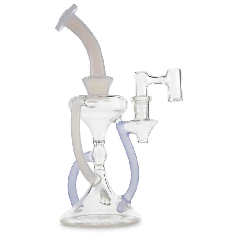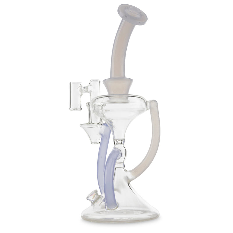 Casa Glass's hourglass recyclers display Casa's mastered techniques while maintaining a clean, high-end look. This amazing recycler is designed with pink slyme on the bent neck and one of the arms. The other two arms feature a beautiful blue cheese color. The body of the pipe is clear allowing you to watch the action. This hourglass recycler features a 14mm Casa Glass banger included with the pipe.