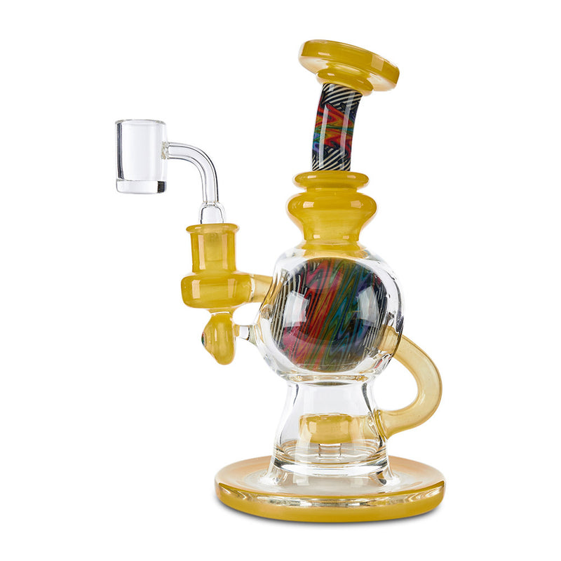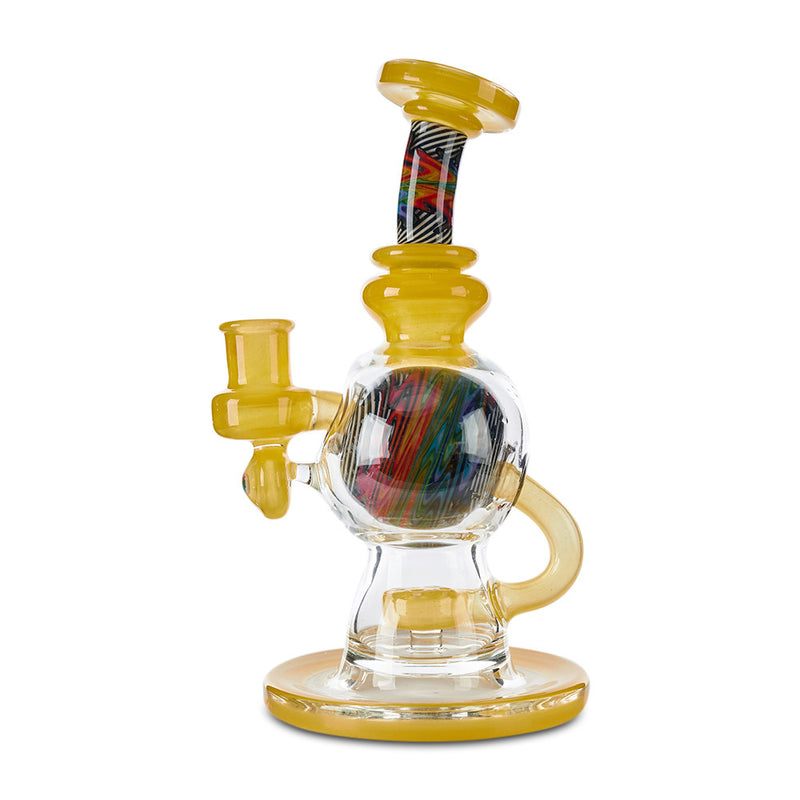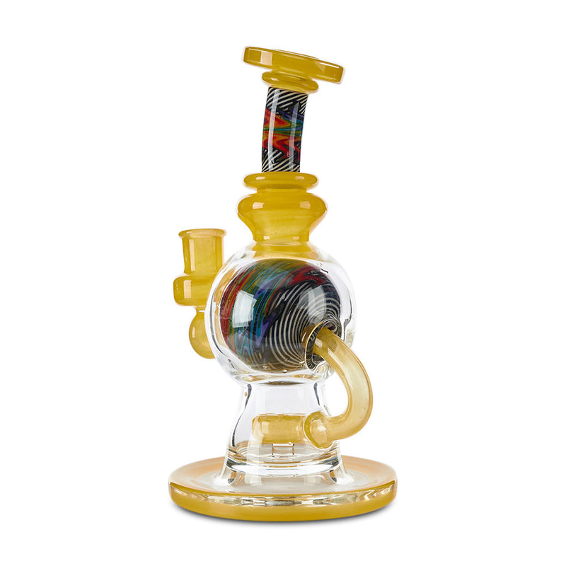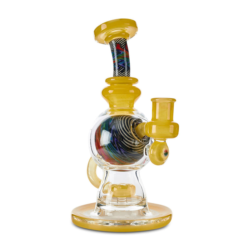 Fresh from Casta Glass, this ball rig is out of this world! Almost completely decked out in double-layered rainbow/jailhouse wig wag sections and a mustard yellow, this rig has so much colored detail to it. The can holds a decent amount of water, and the gap between the walls of the ball and the exterior shell is minimal, resulting in fantastic percolation. In addition, this pipe is very thick, sturdy, and well-constructed.