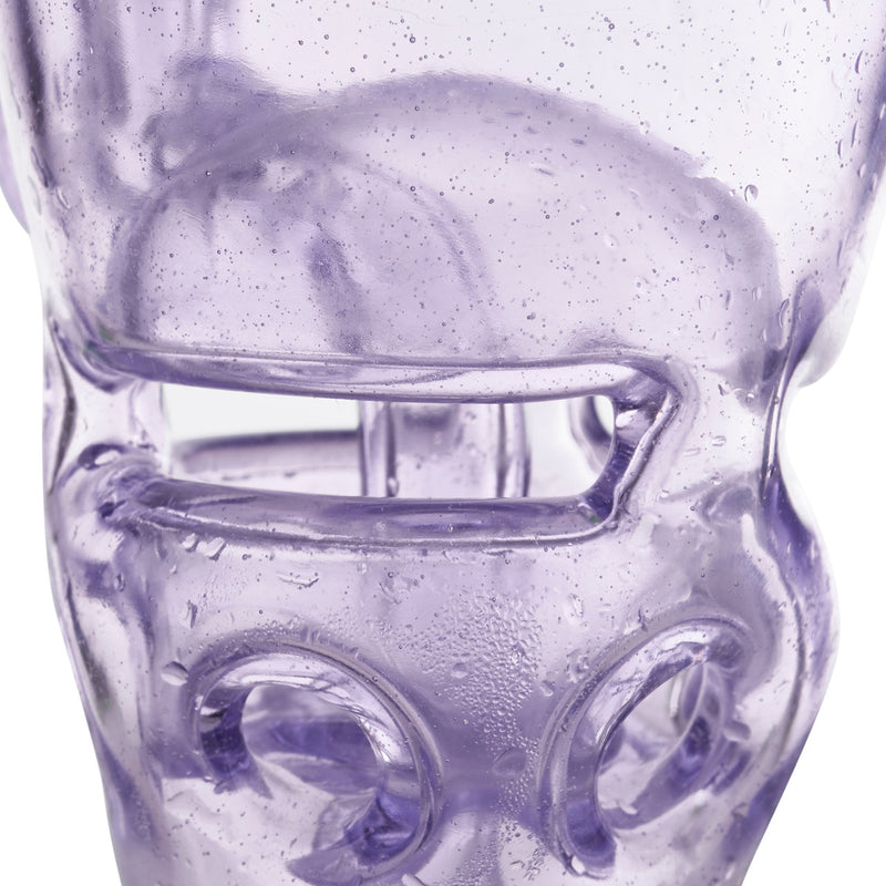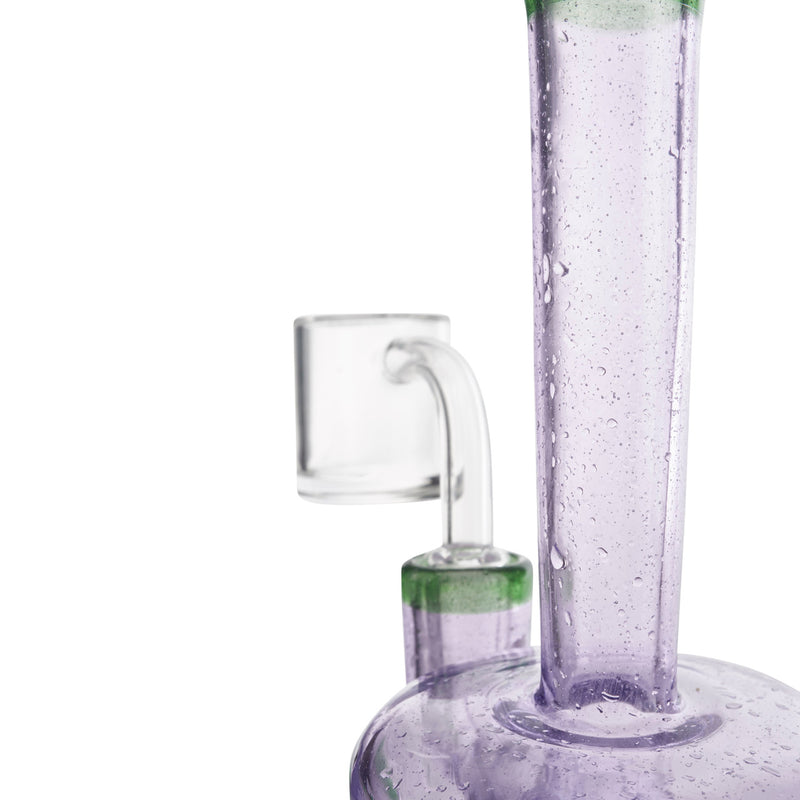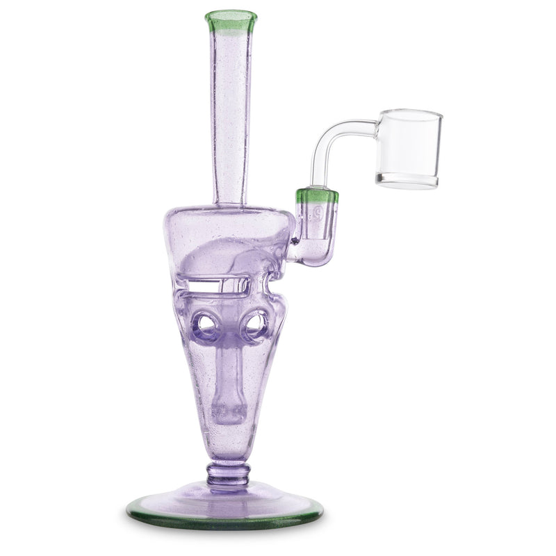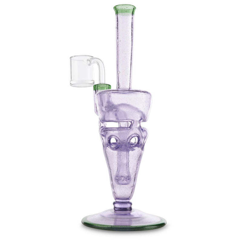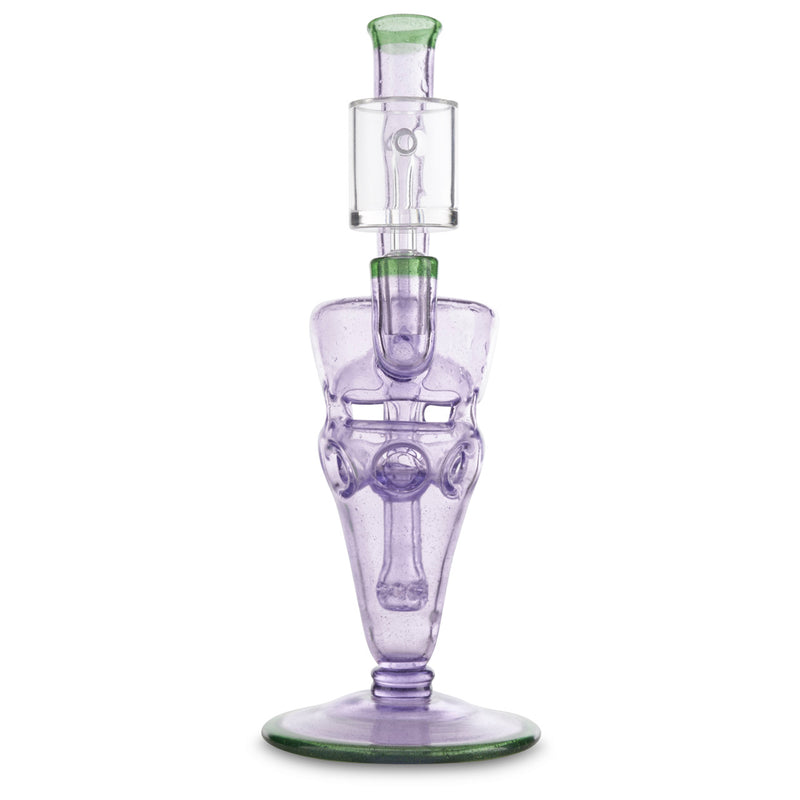 Add a truly unique piece to your glass collection with the Chip x Hefe Venetian Egg water pipe. Chip Glass and Hefe Glass are both legendary glass artists who have combined their styles and techniques to provide this gorgeous venetian egg design. This piece is fully worked with a purple lollipop body and crippy glass on the base rim and lip rim. This piece stands at approx. 9.5" tall and features a 14mm female joint.