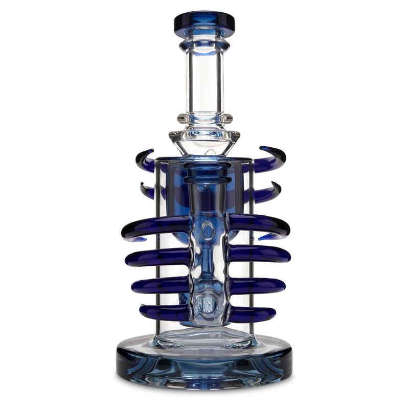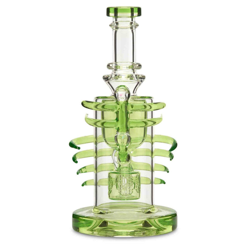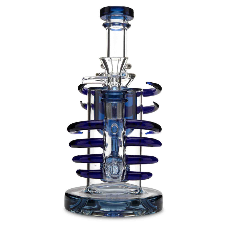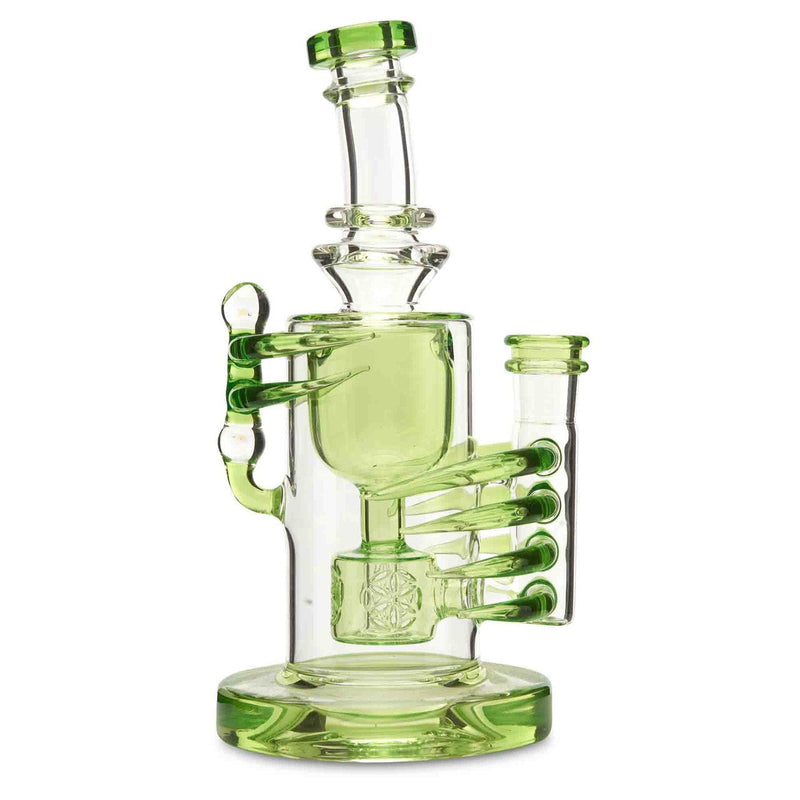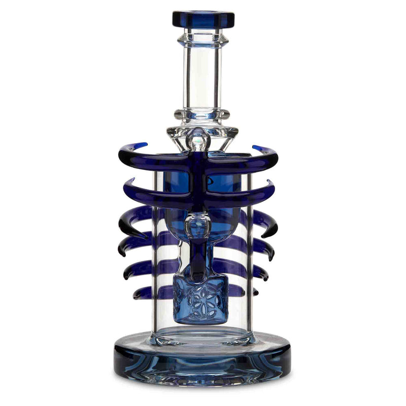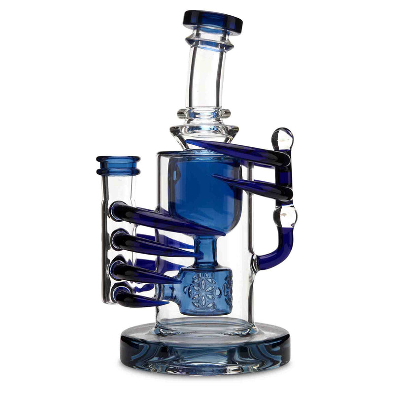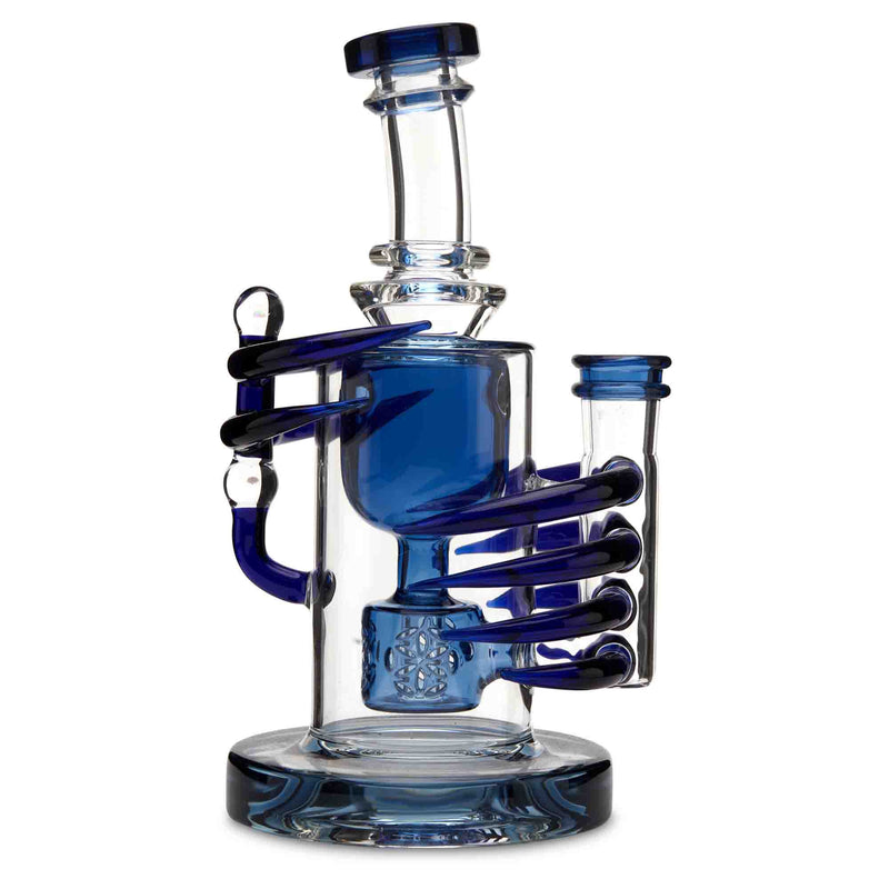 This piece features a two chambered recycling system that is designed to pull water vapor from one chamber to another. Rather than the two chambers being seperate this piece features one recycler inside of the other resulting in a more compact design while still providing the same smooth, flavorful experience we're all after. Along with the recycling system this piece features a Seed of Life Perc for yet another layer of smoothness. Coming in a bold colors, this is yet another amazingly designed piece by Chubbz Glass.