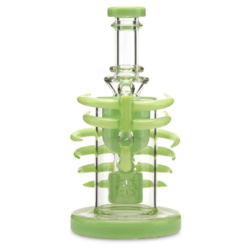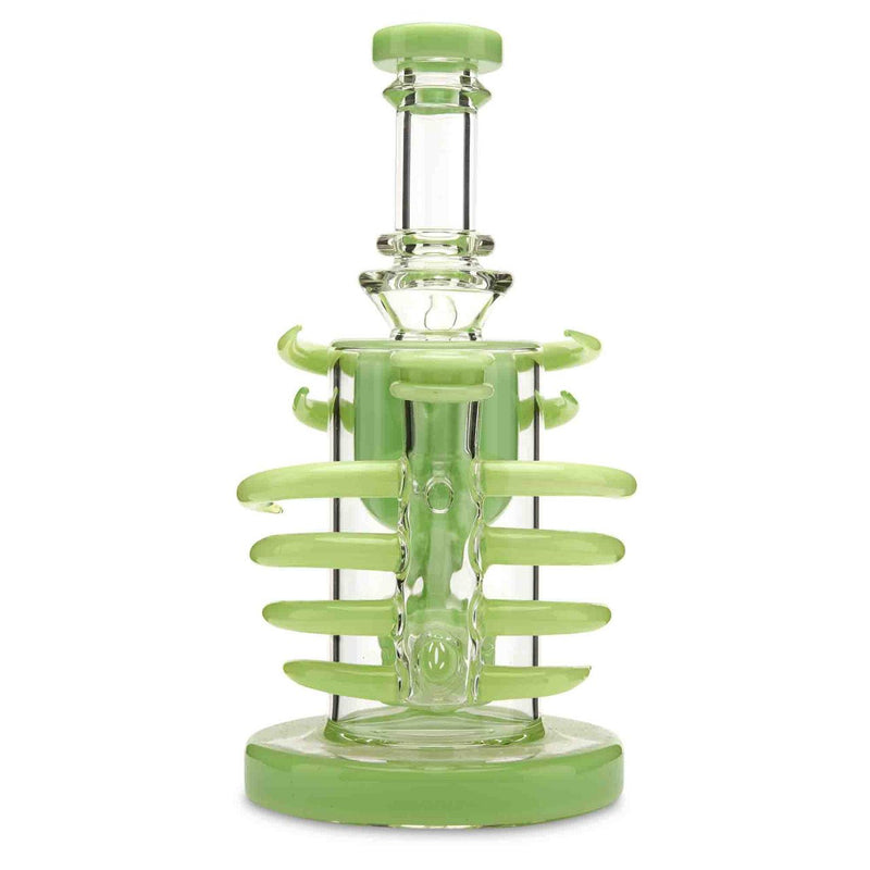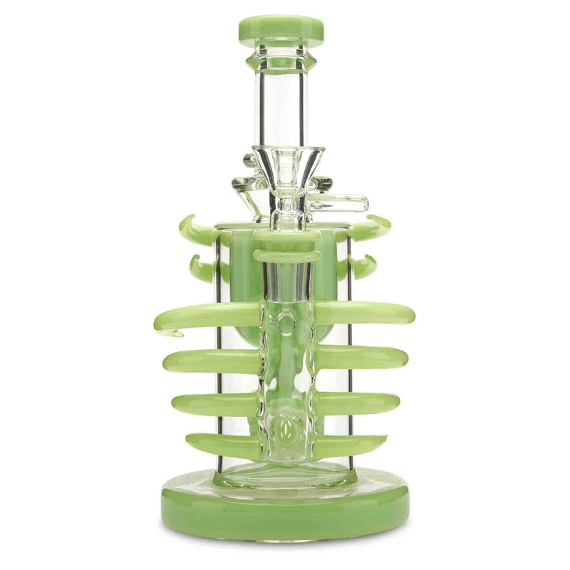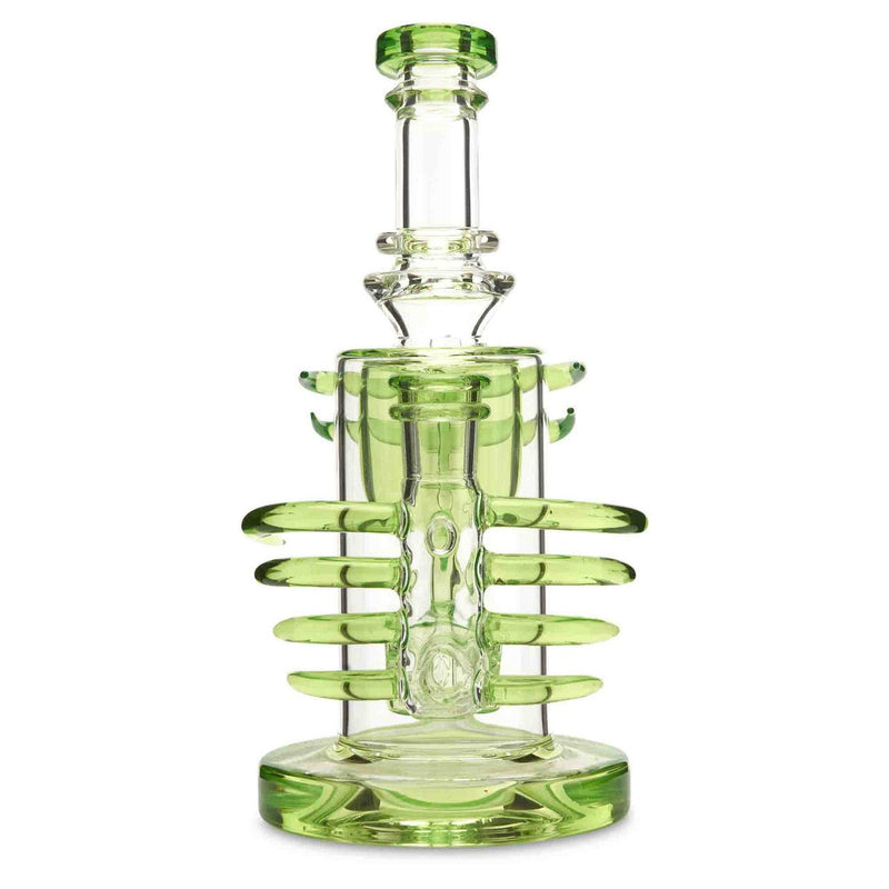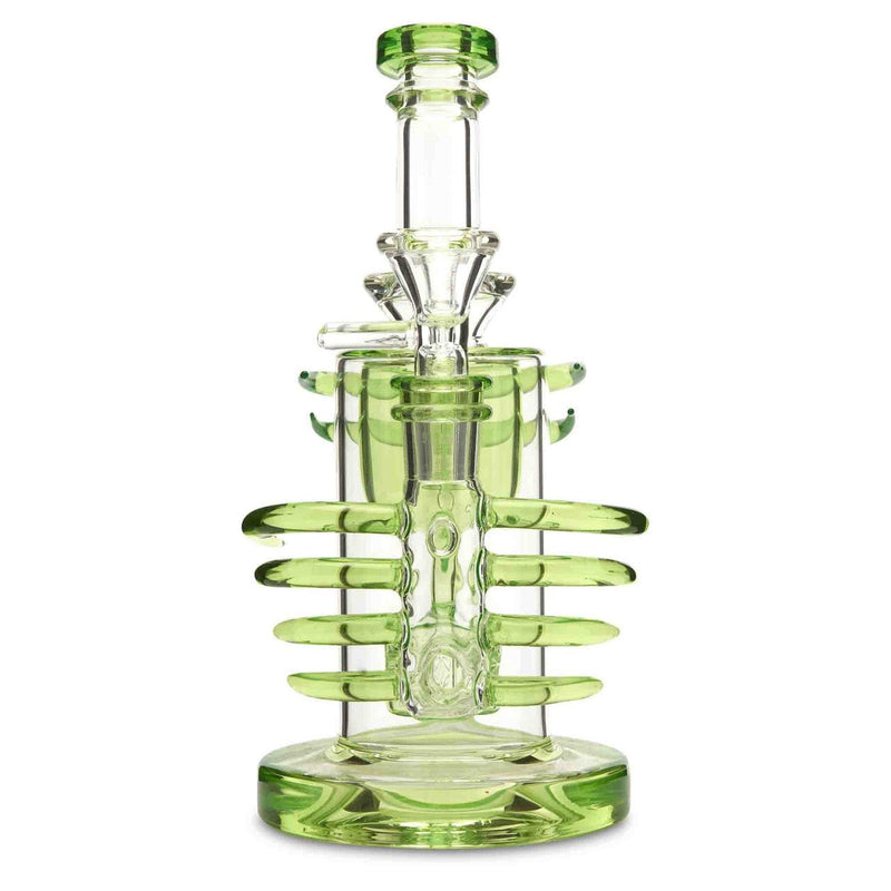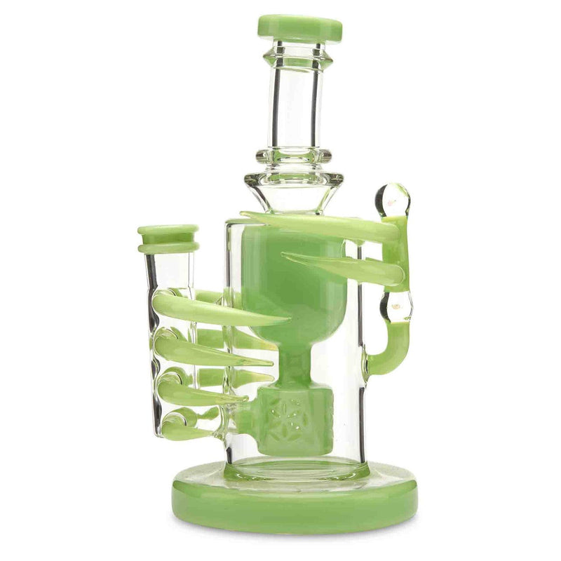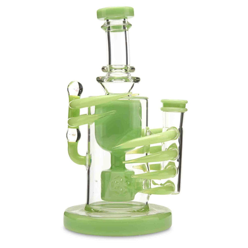This piece features a two chambered recycling system that is designed to pull water vapor from one chamber to another. Rather than the two chambers being seperate this piece features one recycler inside of the other resulting in a more compact design while still providing the same smooth, flavorful experience we're all after. Along with the recycling system this piece features a Seed of Life Perc for yet another layer of smoothness. Coming in a bold colors, this is yet another amazingly designed piece by Chubbz Glass.