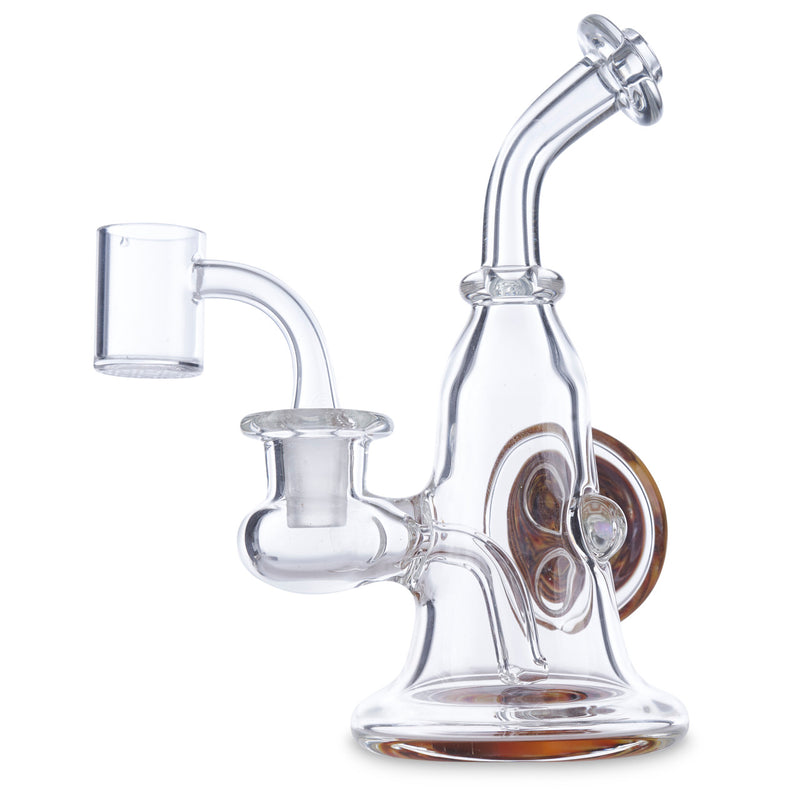 Cristo glass is a Maryland glass artist known for his colorful wig wag designs. This Banger Hanger showcases Cristo's talent with the beautiful orange wig wag design featured on the base with a matching design on the cab featured on the side of the banger hanger. If that wasn't enough, Cristo also added an opal encasement on the back of the rig. Get this beautiful banger hanger today at Cloud 9 Smoke Co.