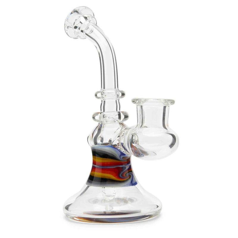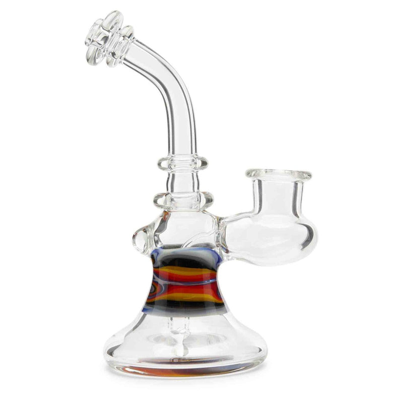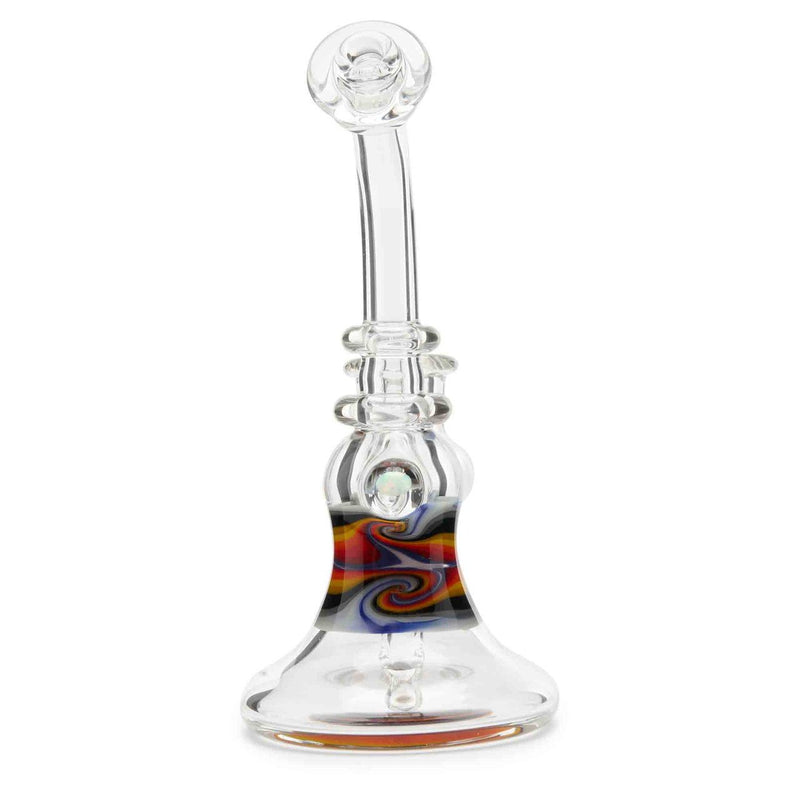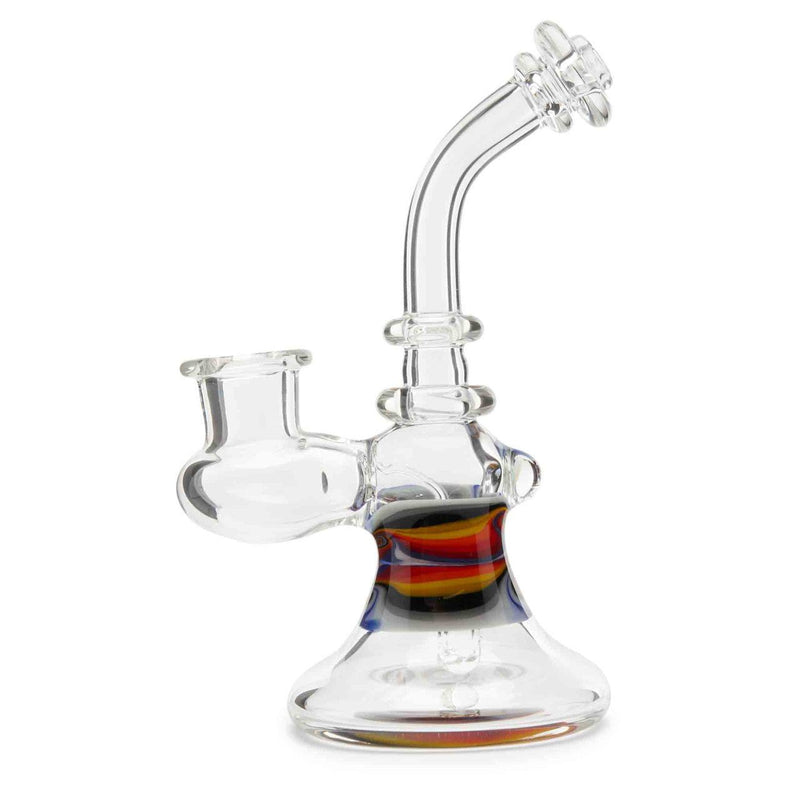 Cristo Glass continues to provide amazing glass art with beautiful wig wag designs. This Cristo Banger Hanger has amazing detail with the rainbow wig wag linework featured on the base of this pipe. This fully worked piece also features an opal encasement on the back of the banger hanger. The banger hanger is made with a 14mm female joint at a 90 degree angle. Get this beautiful piece today at Cloud 9 Smoke Co.!