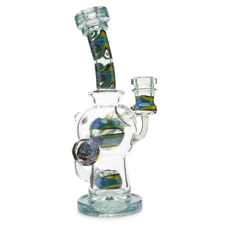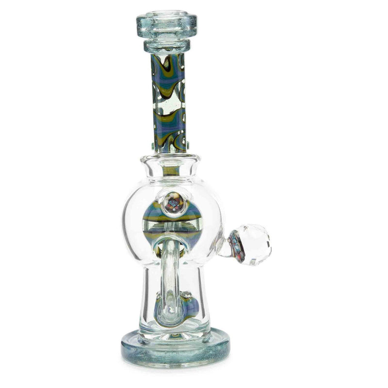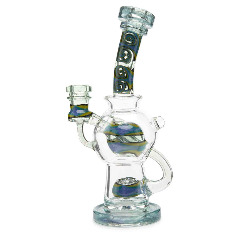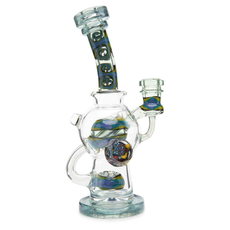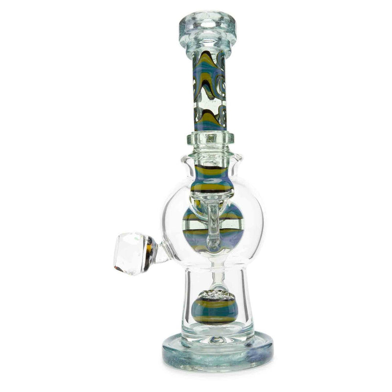 Dynamic Glass makes it pieces in Minneapolis, Minnesota. They are most widely known for their Ball Rigs. This piece shows off the skills of the Dynamic Glass company with its beautiful wig wag designs on the neck and inside of the water pipe. This piece stands 9 inches tall and has a millichip encasement.