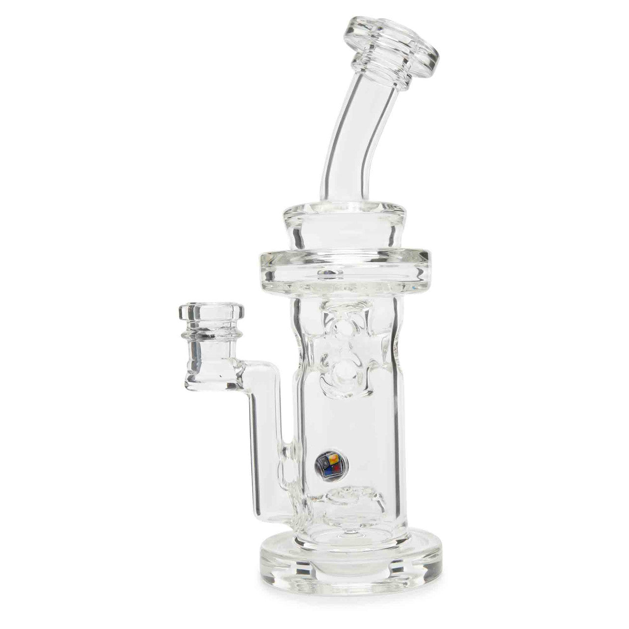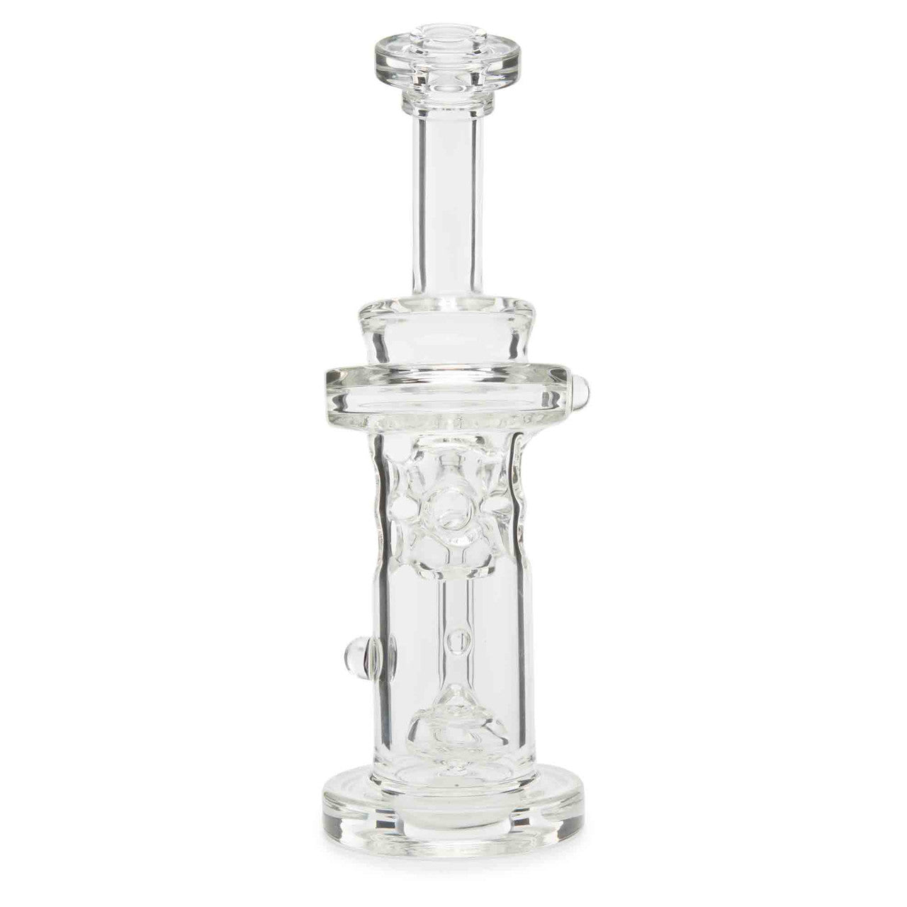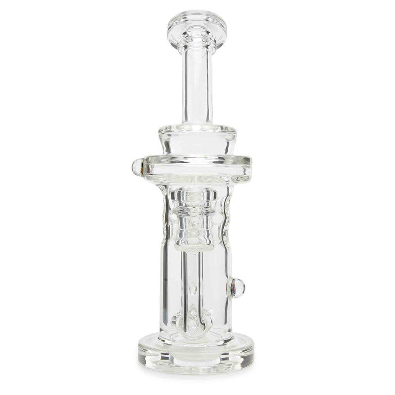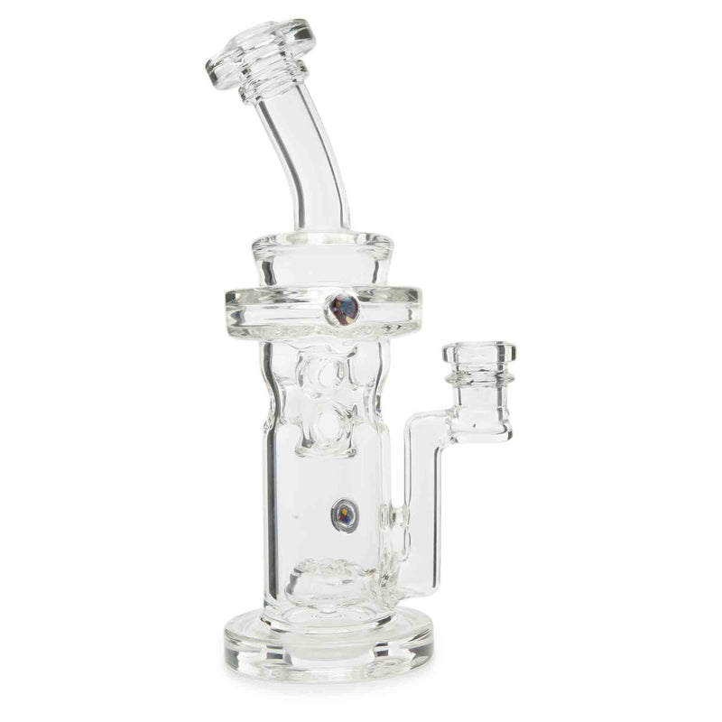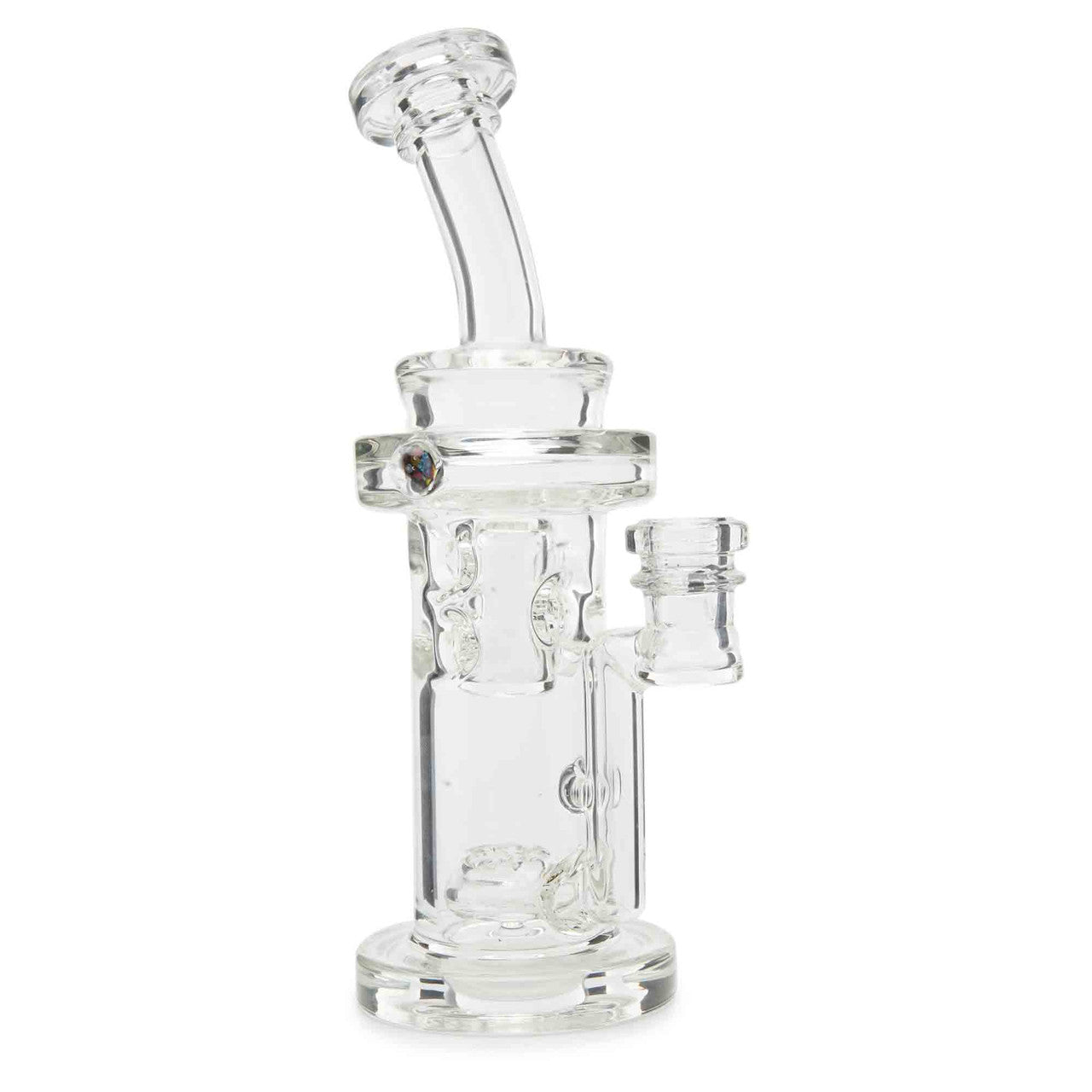 Dynamic Glass is a high end glass art manufacturing company who makes expertly crafted water pipes. This water pipe features a clear glass design with a mili chip encasement. This water pipe stands 7 inches tall and has a 14mm female joint.