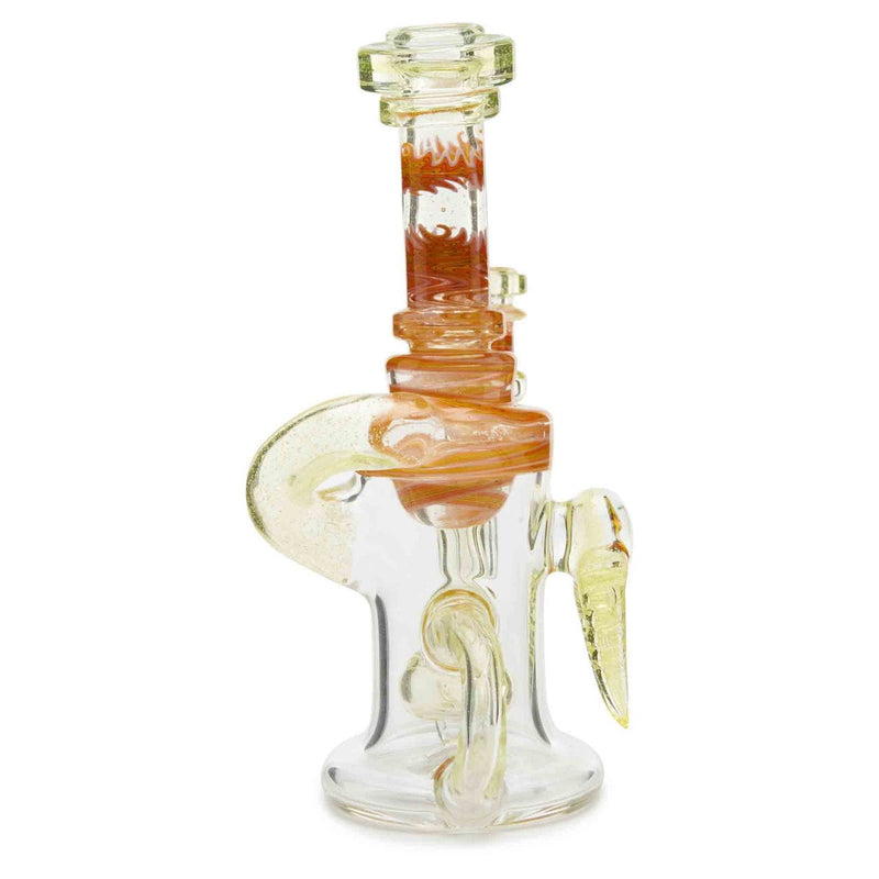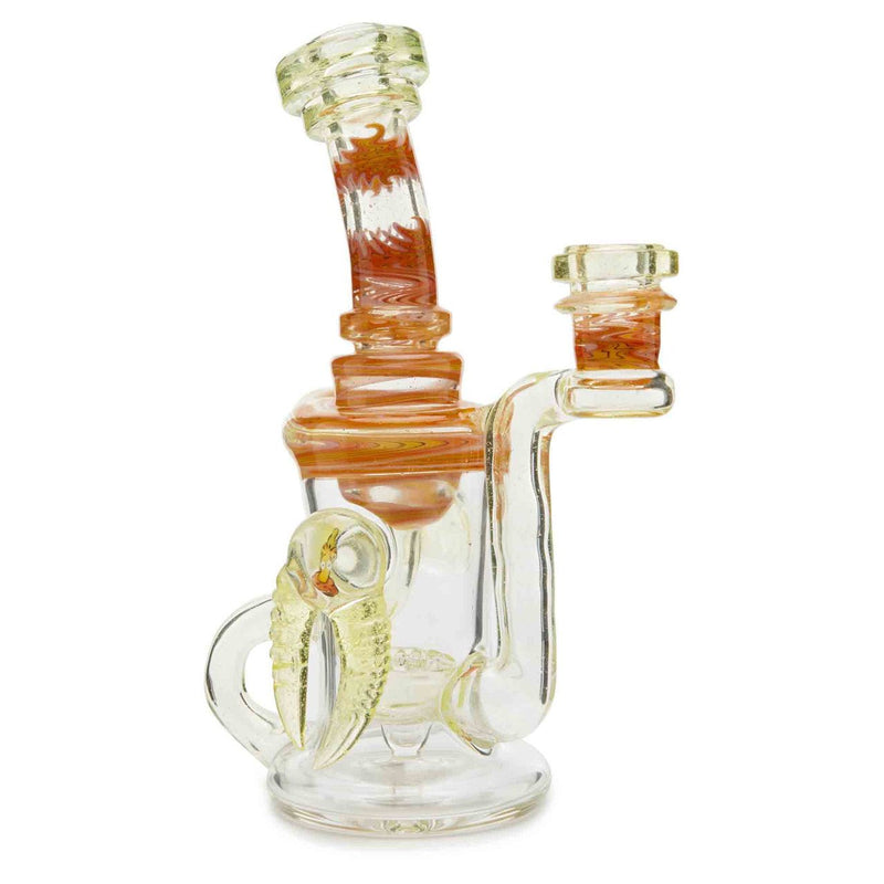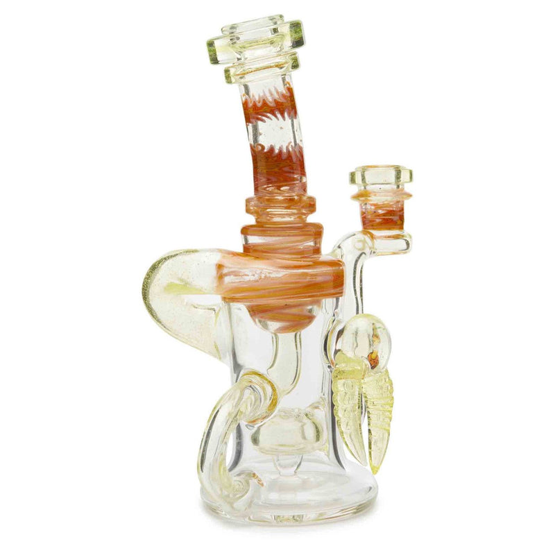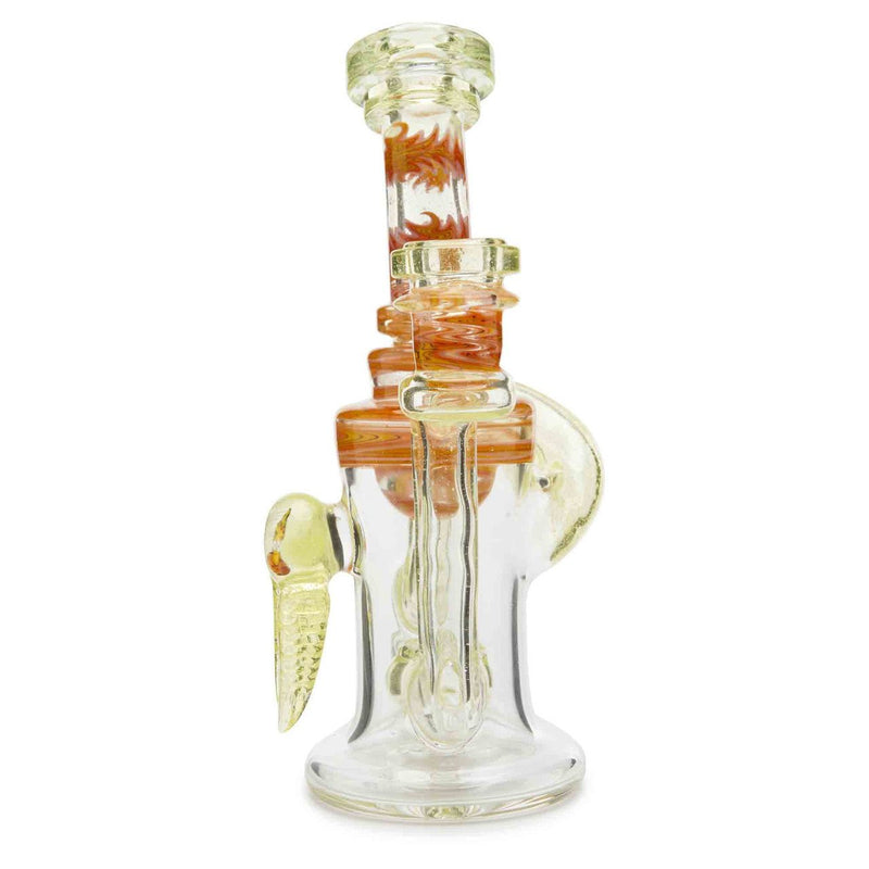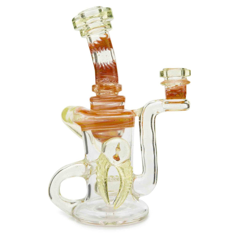 Dynamic Glass is a high end functional glass art company from Minneapolis, Minnesota. They specialize in glass water pipes and are known for the amazing function on their recyclers. This water pipe features fumed glass with beautiful wig wag designs on the neck of the pipe. This pipe also has a disc perc as well as a klein recycler. This pipe also has an encased "Rocko's Modern Life" character.