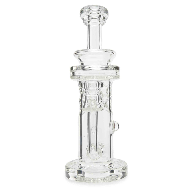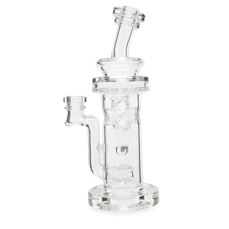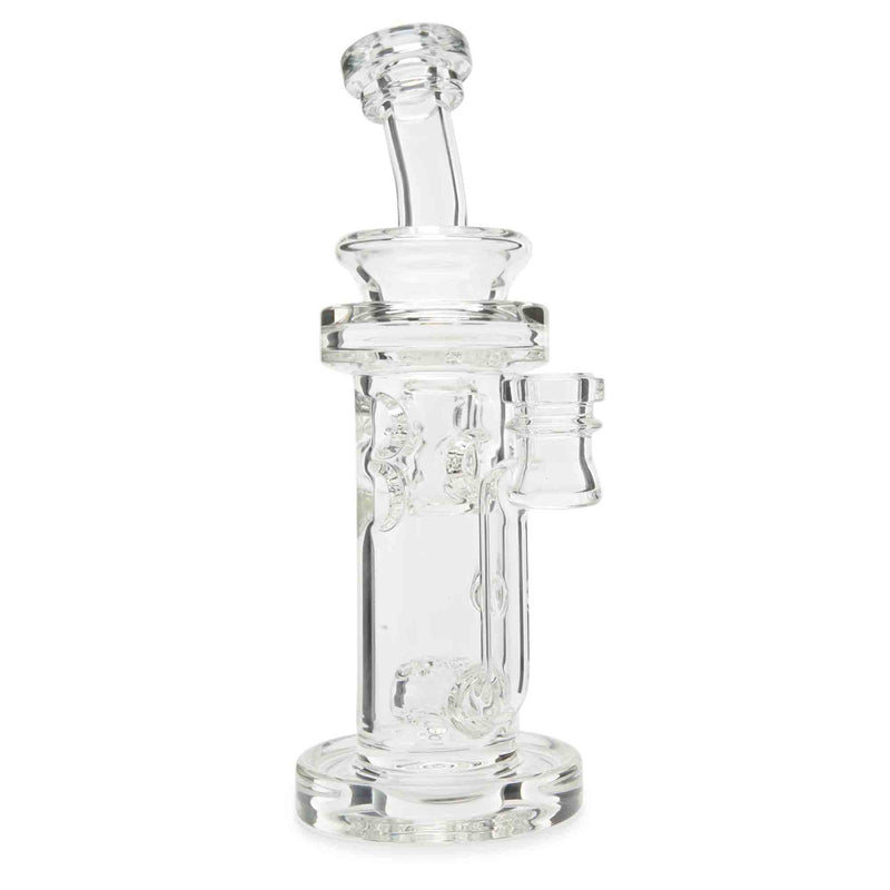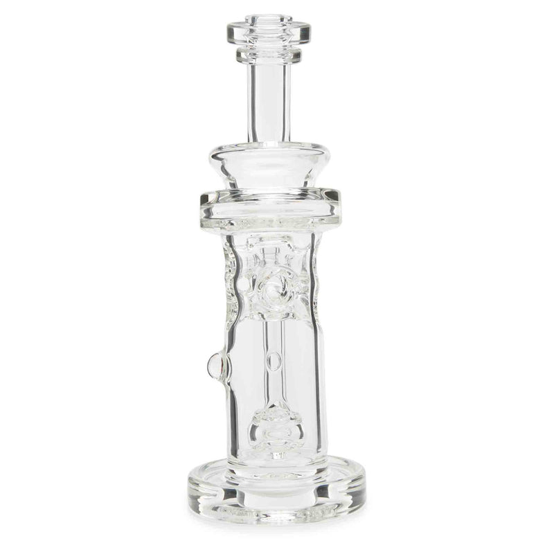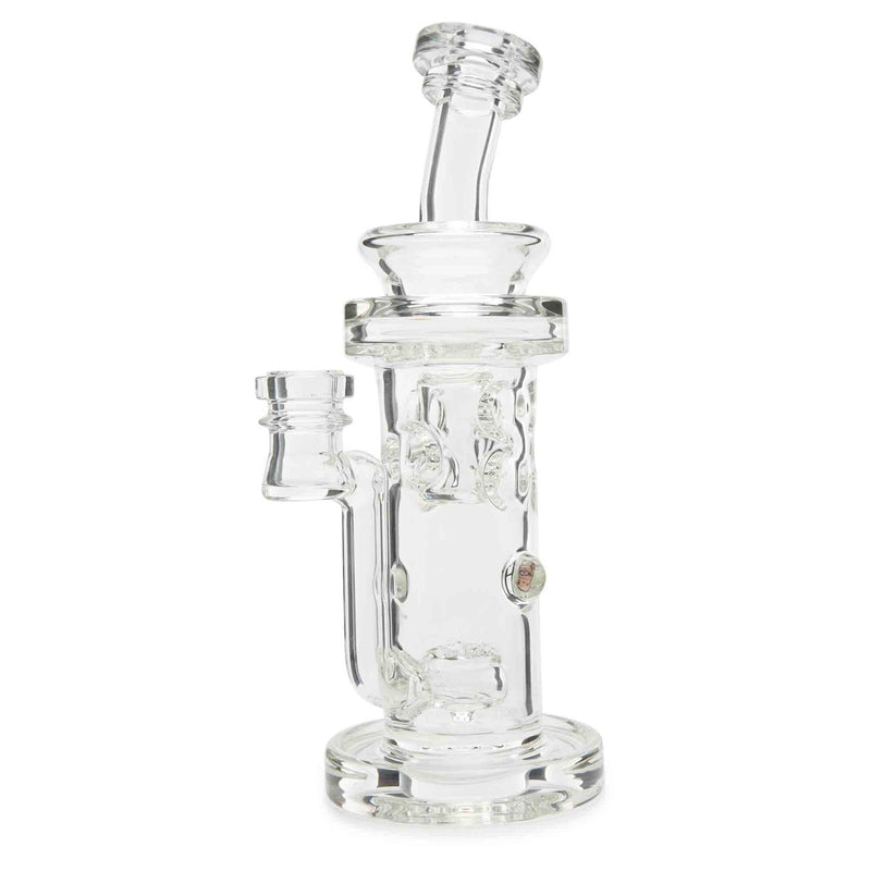 Dynamic Glass is a high end glass art manufacturing company who makes expertly crafted water pipes. This water pipe features a clear glass design with a 'Hank Hill' from the tv show, King of the Hill, encasement. This water pipe stands 7 inches tall and has a 14mm female joint.