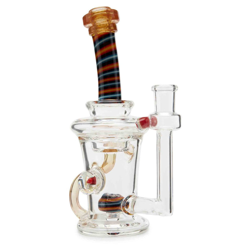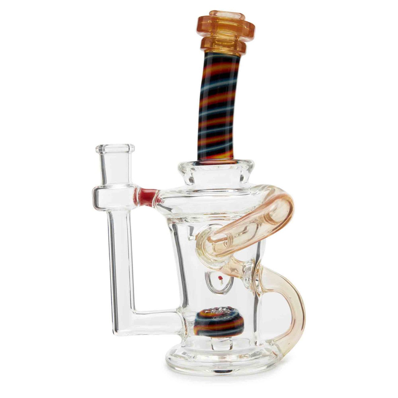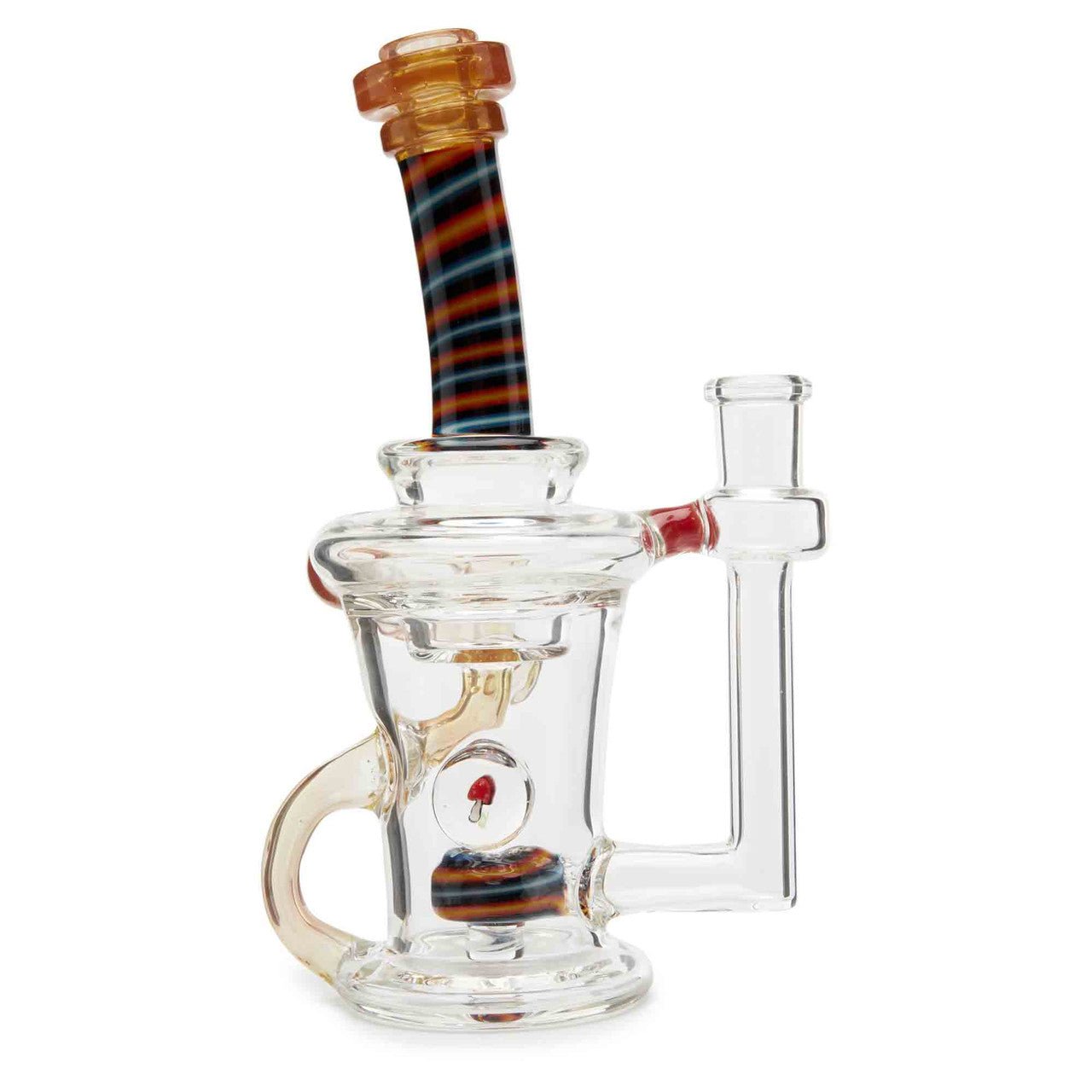 Dynamic Glass is a functional glass art company out of Minneapolis, Minnesota. They specialize is different kinds of recycler water pipes. They are known for their expertly crafted glass pipes. This pipe stands 7 inches tall and has a worked neck design. This piece also features a mushroom encasement as well as a disc perc for smoother hits.