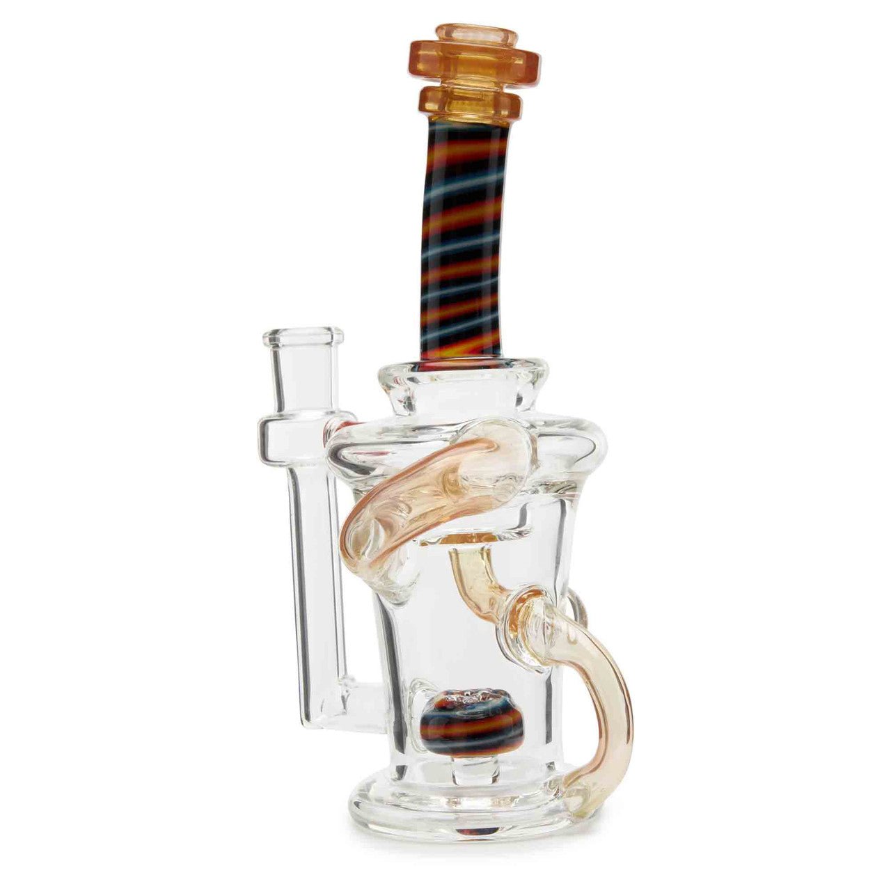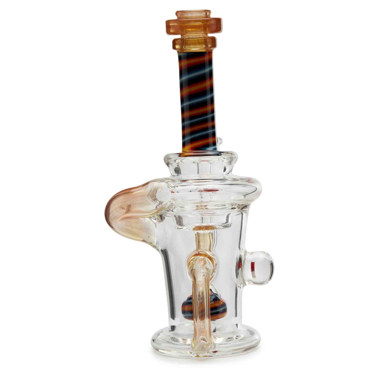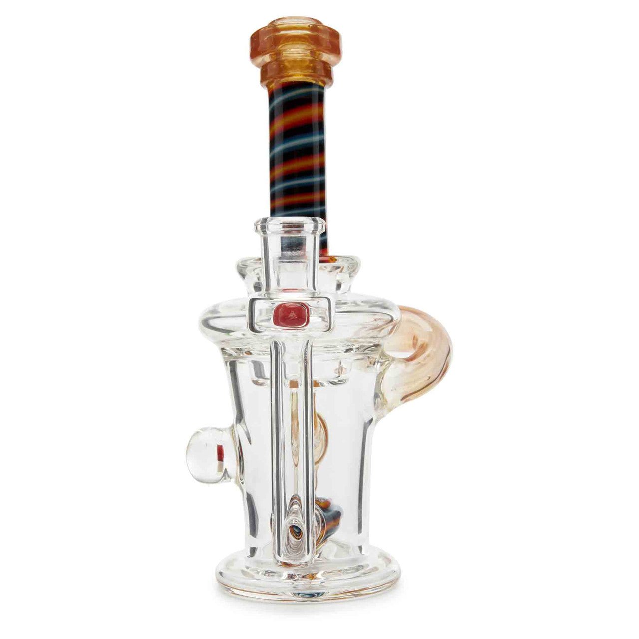 Dynamic Glass is a functional glass art company out of Minneapolis, Minnesota. They specialize is different kinds of recycler water pipes. They are known for their expertly crafted glass pipes. This pipe stands 7 inches tall and has a worked neck design. This piece also features a mushroom encasement as well as a disc perc for smoother hits.