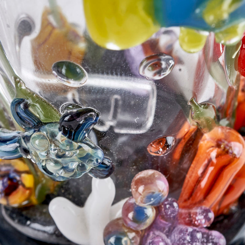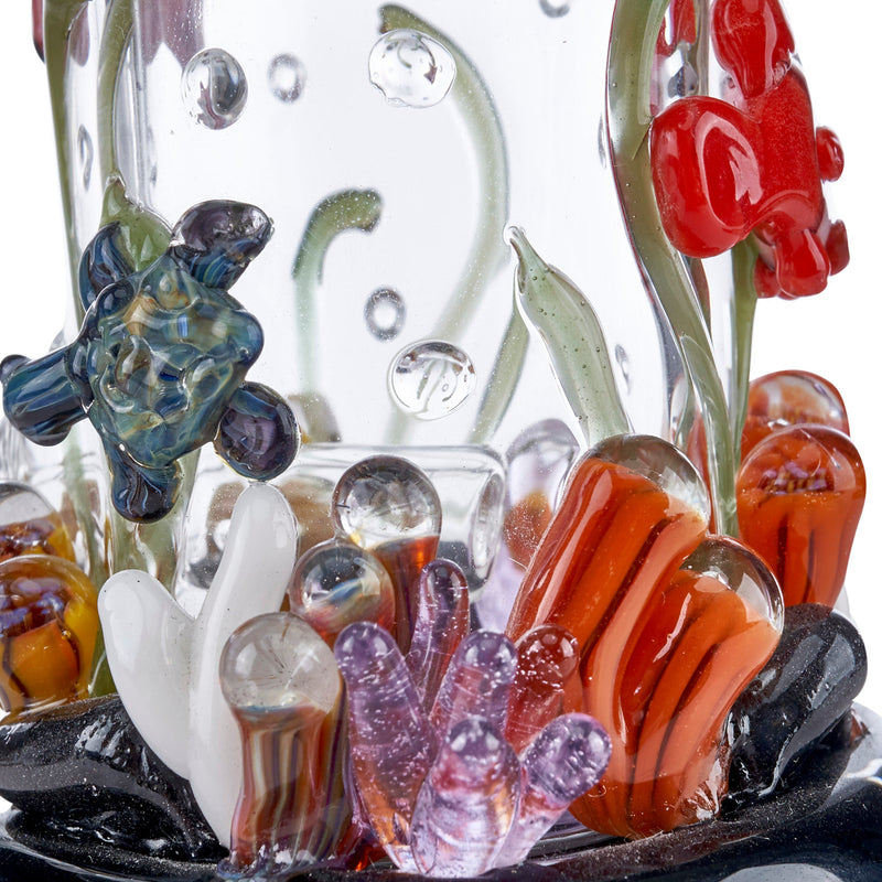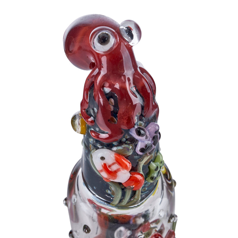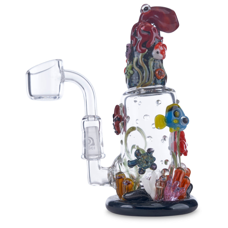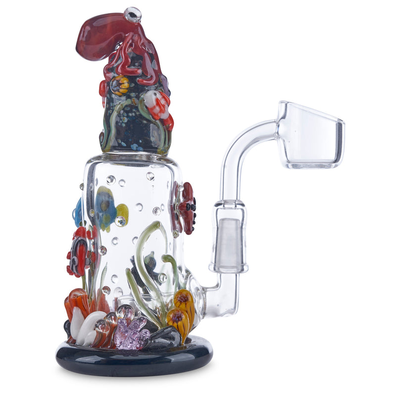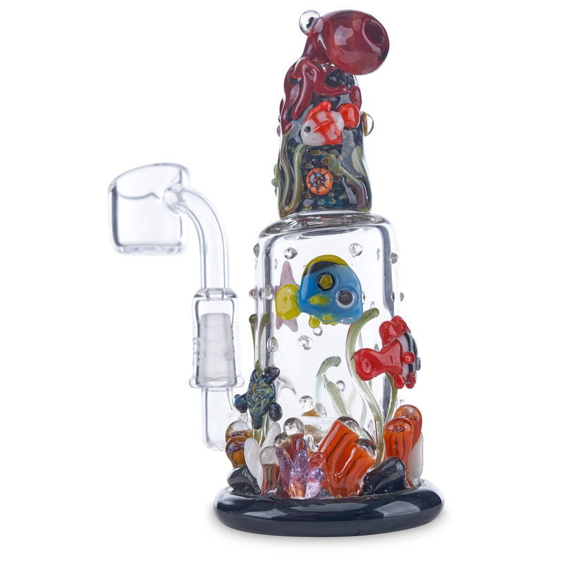 Empire Glassworks started in 2013 in Placentia, CA. This young company is compromised of artists and owners who have over 40 years of experience in the glass-blowing industry. Each of their glass art pieces are truly exquisite with extreme attention to detail and beauty. The aquarium banger hanger is a magnificent rig with various sea creatures and fish featured throughout the pipe. This banger hanger has a 10mm joint at a 90 degree angle. Get the Aquarium Banger Hanger by Empire Glass today at Cloud 9 Smoke Co.!