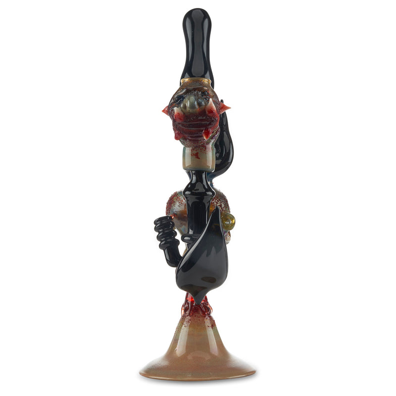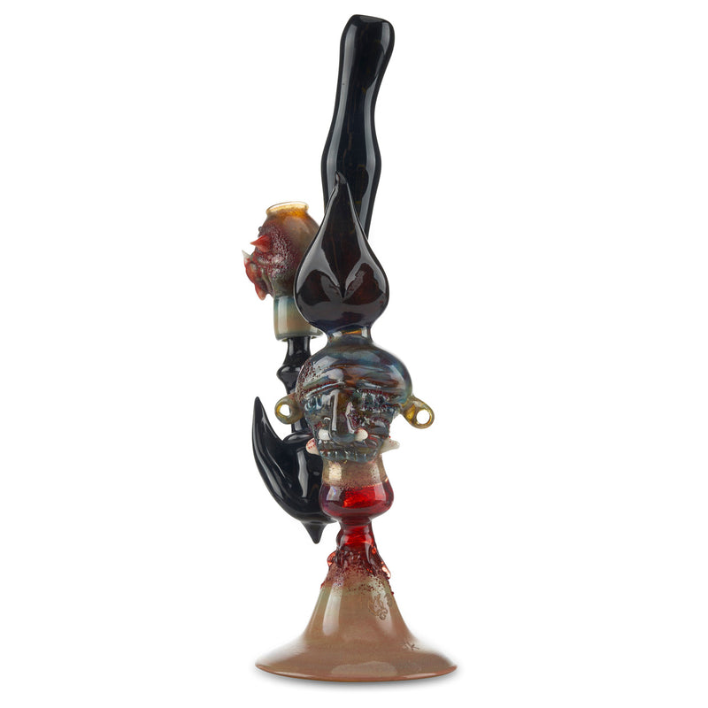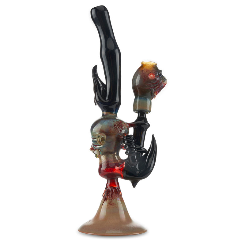 Erik Anders is a legendary glass artist who currently works out of Colorado, originally Rochester, NY. This insane banger hanger is a sculpture water pipe with amazing attention to detail. This piece features epic color designs on the sculpture with red glass giving off the appearance of blood going down the banger hanger. The stem and joint of the piece is made with black glass and features black feathers coming out of the pipe. Additionally, this gorey banger hanger features a matching fully worked dome. The rig stands at approx. 12" tall and has a female joint. Get it today at Cloud 9 Smoke Co.!