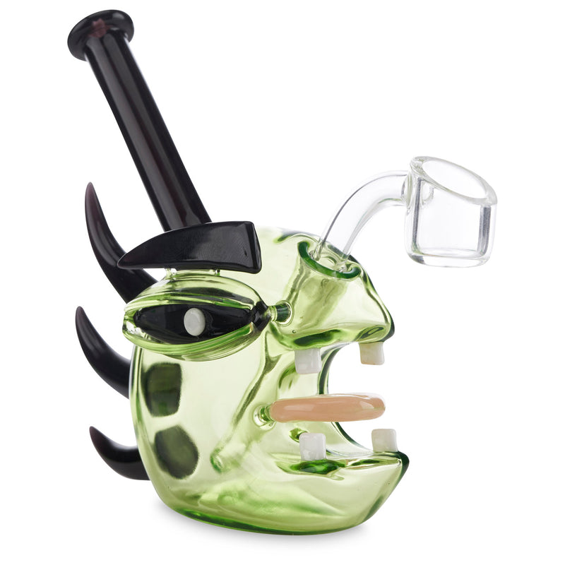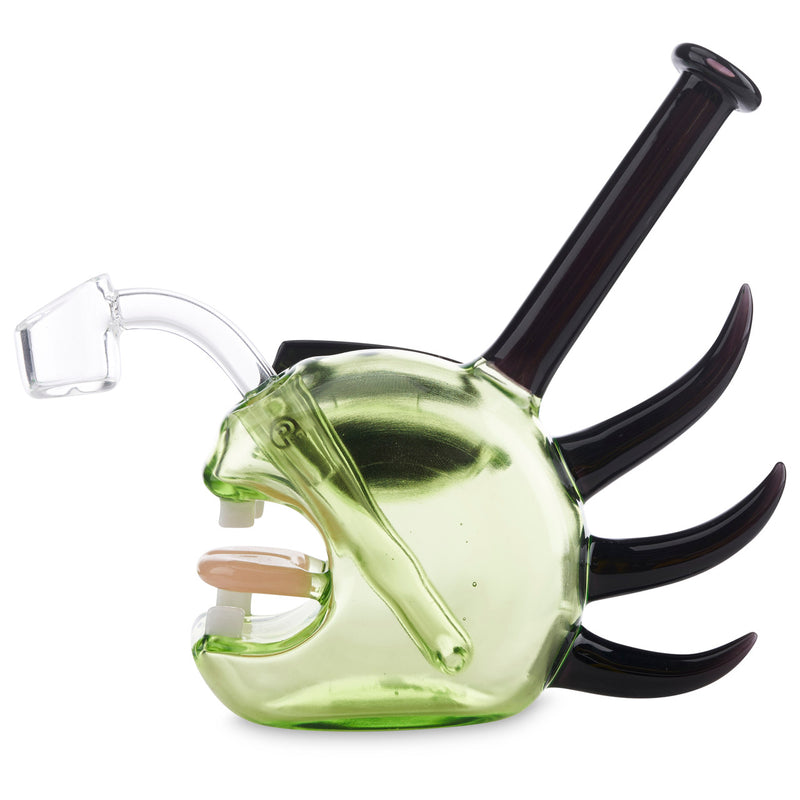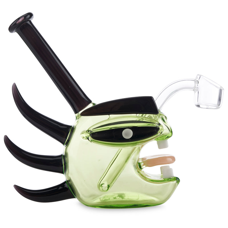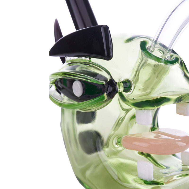 Etai Rahmil has been creating amazing glass art since 2012. He has a passion for creating sculptural interpretations of masks and antiques that is clearly displayed in this mini shredder. This awesome and unique mini shredder features many intricate details with a perfectly proportional sculpted face and features. This mini shredder is designed with a haterade head along with black features on the face, back, and a black neck. This piece stands at approx. 5" tall and features a 10mm female joint.