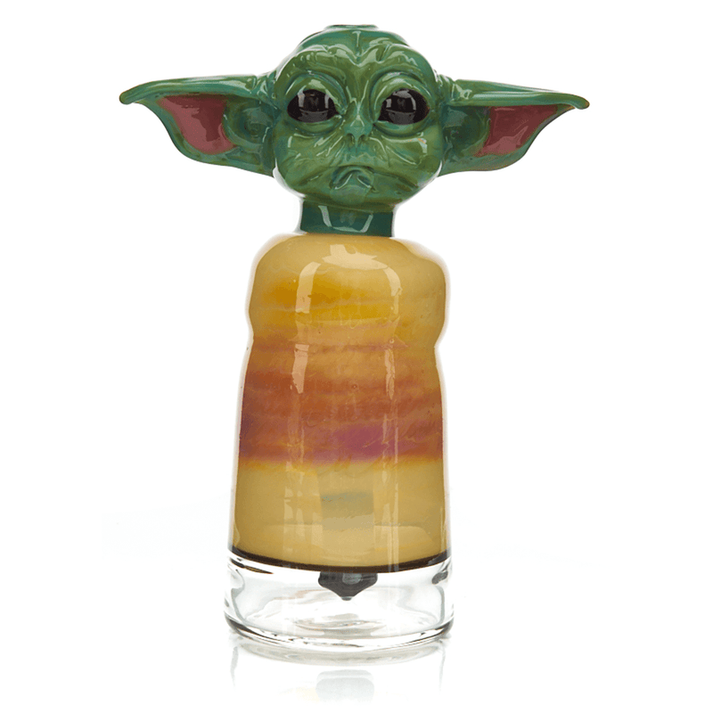 A mixture of caning and frit, this Baby Yoda Heady Dab Rig by Fish Glass features a gradient of colors growing from a ale green on his face, to shades of brown and khaki on the body of this piece of heady character glass. Baby Yoda also comes with a transparent custom one of one carb cap and features cross hatched section upon its “skin” to represent texture. Fish really made a symmetrical, succinct heady dab rig in this Baby Yoda Piece.