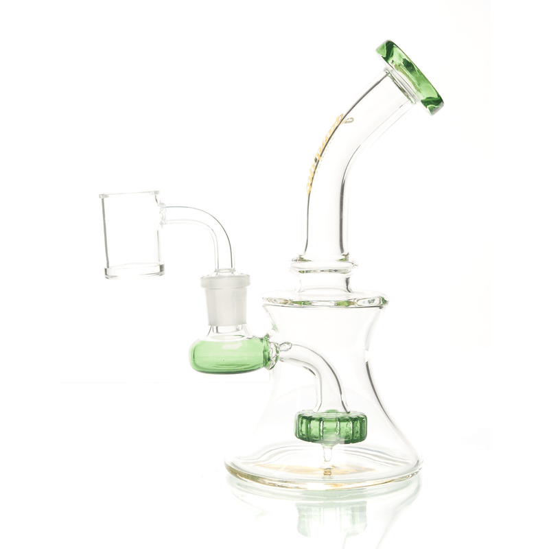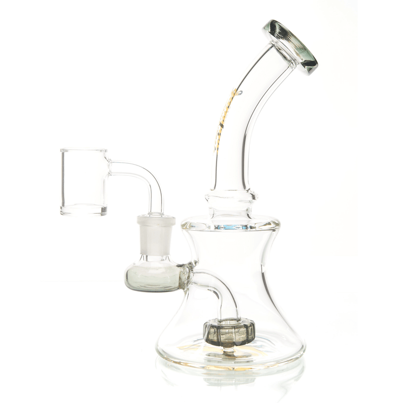The Gambino SH Hanger is the perfect dab rig, or compact water pipe, for all tokers looking to add a bit of spice to their glass collection! The Gambino SH Hanger features lustrous tubing crafted from borosilicate glass. It’s hourglass shape gives your smoke, or concentrate vapor, the perfect room to filtrate while keeping terpene profiles in tip-top shape! The SH Hanger features a 90-degree joint piece with a fixed percolator downstem. To make all hits, rips, and tokes buttery smooth, the SH Hanger features a fixed showerhead percolator! With the SH Hanger, you won’t have to worry about any nasty water getting into your way with its lipped splash guard and bent neck. The Gambino SH Hanger is outfitted with colored accents on its joint piece, percolator, and mouthpiece as well as golden Gambino Studios branded logos on the base and neck! Choose between 5 color options to personalize this wonderful water pipe to your aesthetic!