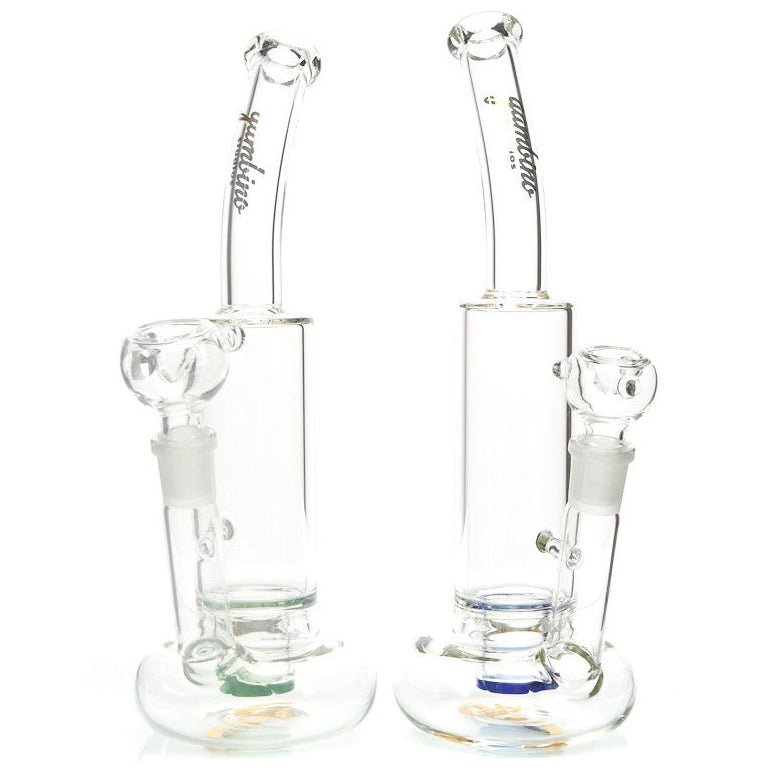 Twist into euphoria with the Gambino Tornado Dab Rig! Gambino is already known for providing high quality tempered glass and stellar hand pipes and water pipes, but take an extra look at this dab rig, as Gambino has hit the sweet spot in terms of size, durability, and function. This dab rig features a simple yet elegant slightly bent neck that feeds into a larger than average chamber, ultimately concluding into succinct 5 hole diffuser. Though the picture advertises a dry herb attachment, this pipe is know for its work with concentrates. The sleek size makes it an easy travel companion and the fixed downstem adds to this piece’s durability. Without many of the bells and whistles, the cost of this dab rig remains moderate, though it still delivers the punch that Gambino water pipes and dab rigs are known for.
