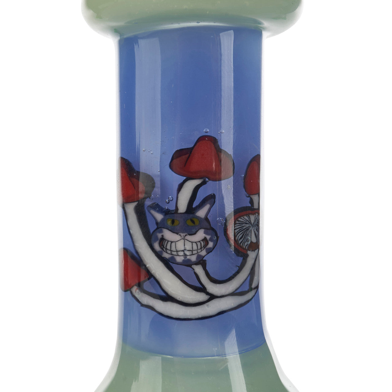Fall into the rabbit hole with the Grimm Mushroom Mini Tube. This beautiful mini tube is fully worked with beautiful mint green glass on the body of the pipe. The neck of the pipe features a detailed murrina that will take you right into wonderland. The murrina features mushrooms surrounding the head of cheshire cat. This unique rig stands at only 5.5" tall with an angled joint. Get the Grimm Glass Mushroom Mini Tube today!