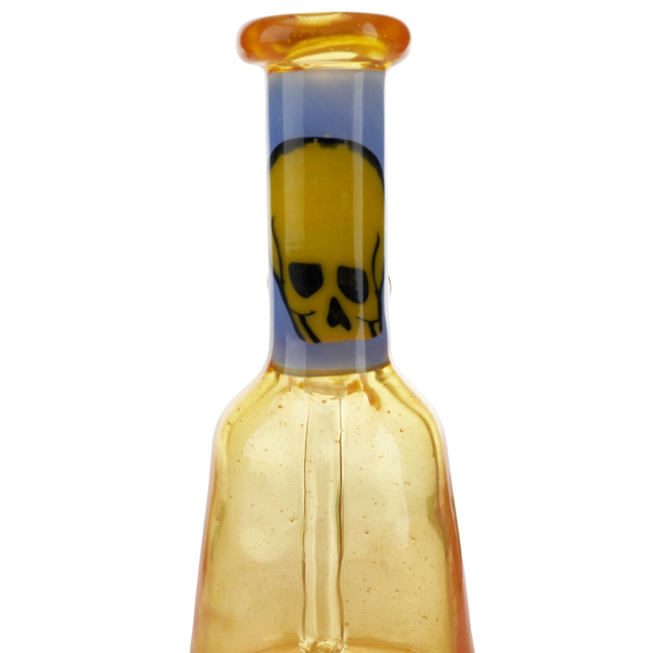 Grimm Glass is incredible at creating unique and highly detailed glass pipes. This Grimm Glass Mini Tube stands at only 5.25" tall making it great for travel and on-the-go use. The body and lip rim of the pipe is designed with beautiful orange glass. The neck of the mini tube features a gorgeous murrina encasement with a yellow skull on light purple glass. Get this beautiful mini tube today at Cloud 9 Smoke Co.!