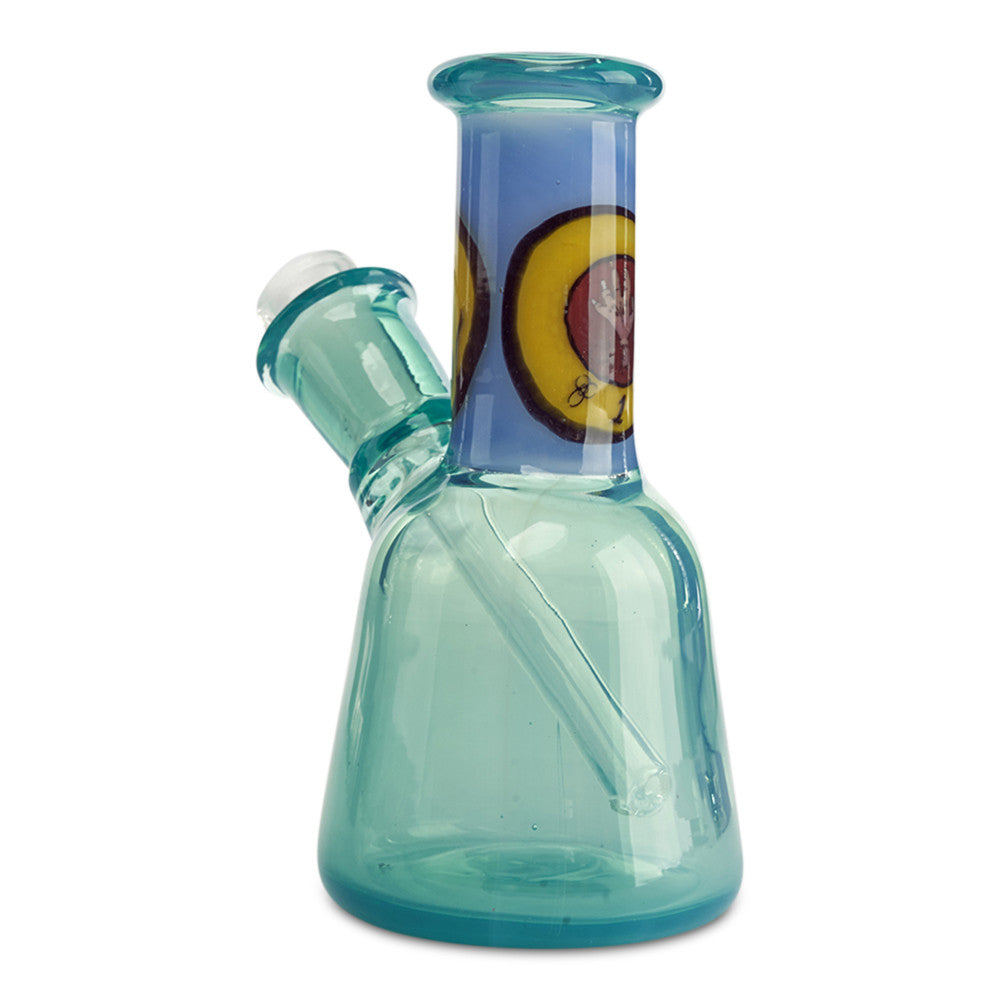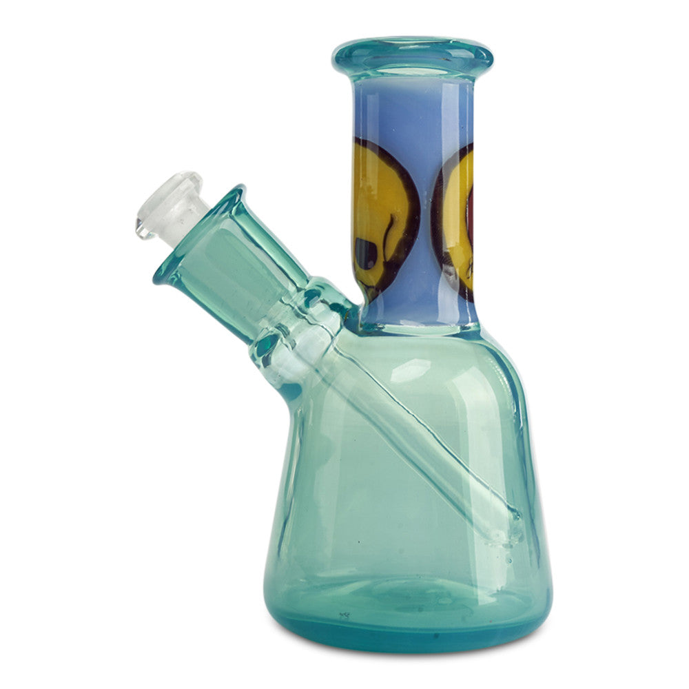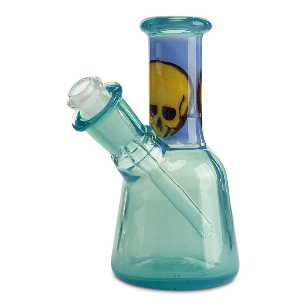 Grimm's mini tubes are the fuego! This particular one features gorgeous color combinations with a transparent teal body and a yellow skull design on the light blue mouth piece. This tube stands at 5.5" tall and has a removable 3-hole downstem with a 10mm joint.