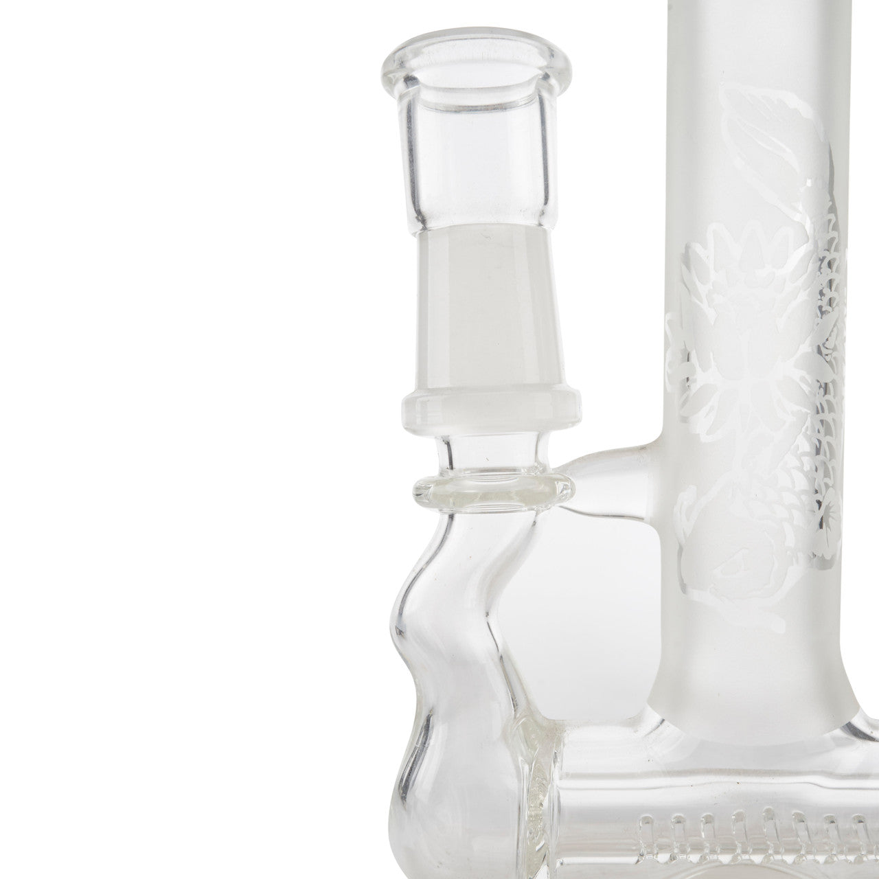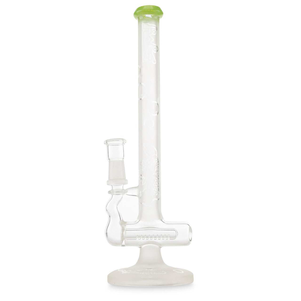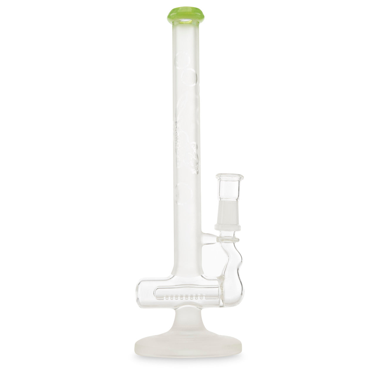 Hops Glass is a Philadelphia glass artist known for his unique pipes and inline percolators. This beautiful peashooter water pipe is cold-worked and frosted throughout the pipe. The lip rim of the piece is designed with a slyme green color giving this piece just enough color to pop out. This water pipe stands at approx. 11" tall and features Hops Glass's signature inline percolator. This amazing piece is made with a 14mm male joint.