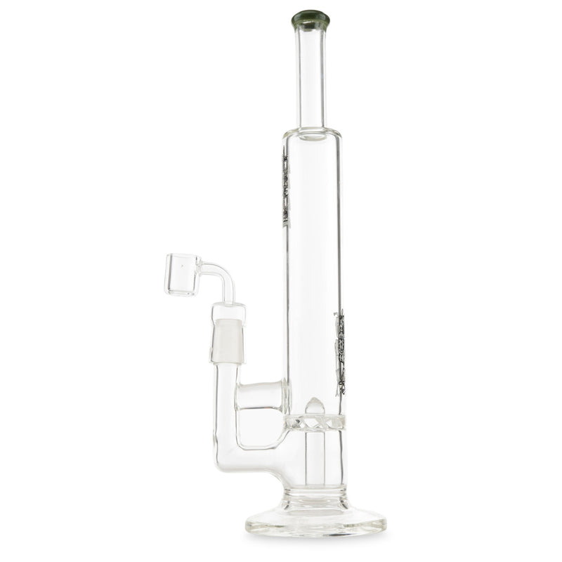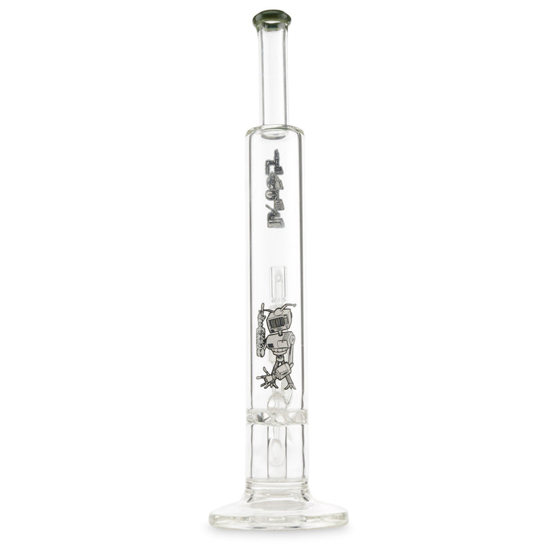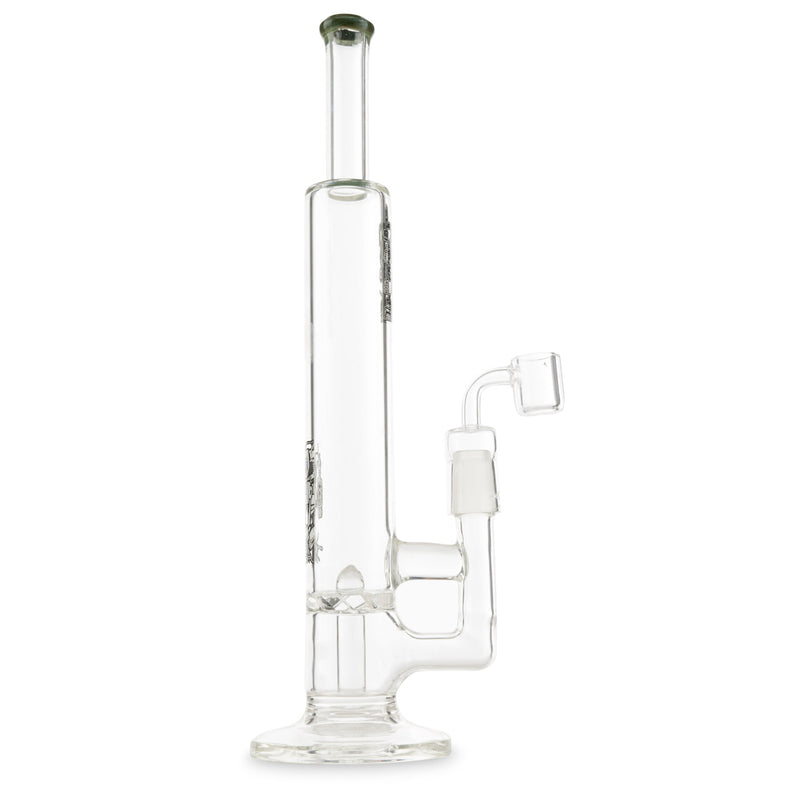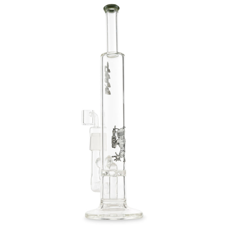 Hops produces amazing pieces and this beautiful turbine rig is no exception! This Hops Glass water pipe functions amazingly with the turbine perc. Turbine percs or vortex percs are glass discs with accurate angled slices equally distributed around the disc. When you take a hit, the water is pulled through the angled slits in a vortex fashion that creates a whirlpool effect. This movement cools down and spreads your smoke for smooth, refreshing hits that are also fun to watch. Additionally, this pipe features a dope Hops Glass logo and a robot printed on the stem of the pipe, and it has a forest green color lip rim. This water pipe stands at approx. 12.5" tall with a 14mm male joint.