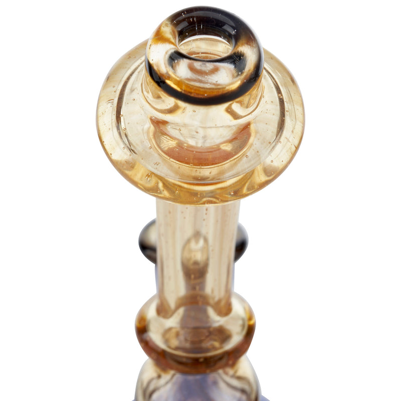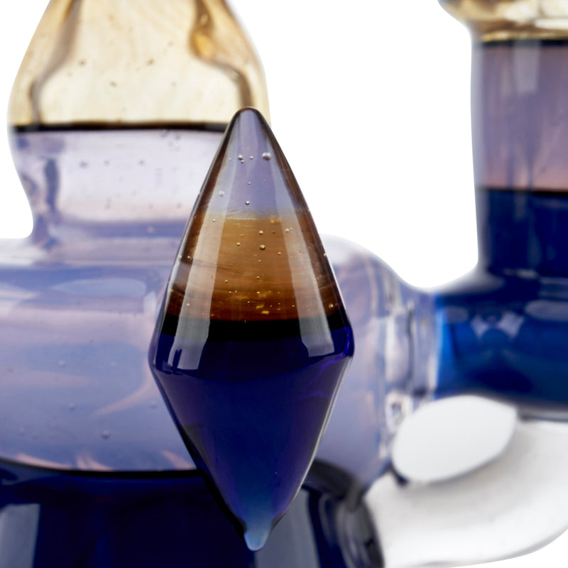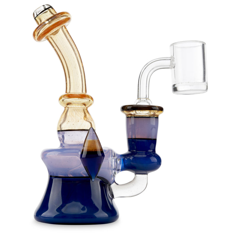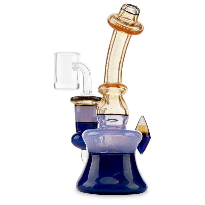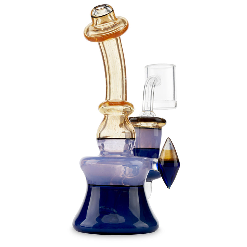 Huffy Glass has been working as a glass-blower for over two decades. He combines 8th-century Venetian methods with modern concepts in his glass art. This beautiful banger hanger by Huffy Glass features beautiful stacked coloring. This piece is designed with dark cobalt on the bottom of the piece, skyline on the middle of the pipe, and peach glass on the neck. Additionally, there is a signature Huffy diamond featured on the side of the banger hanger. This banger hanger stands at approx. 6" tall and features a 14mm female joint.