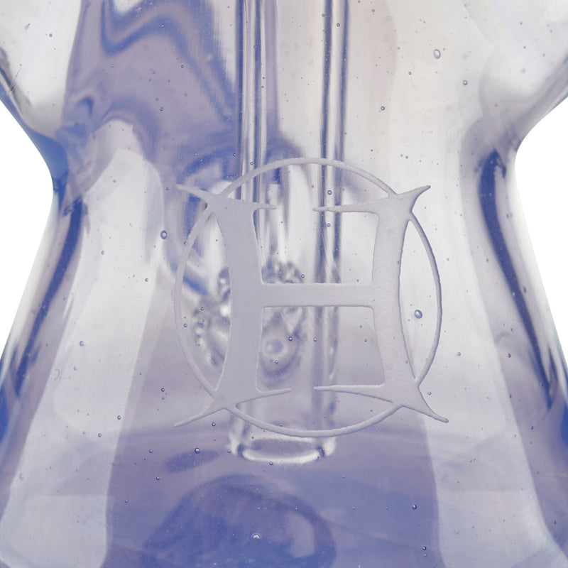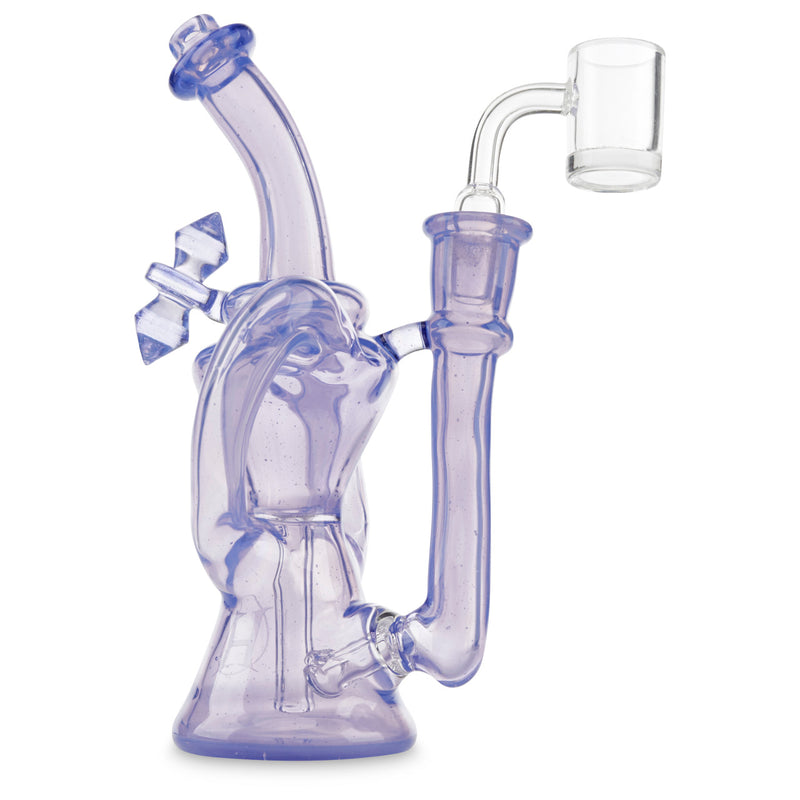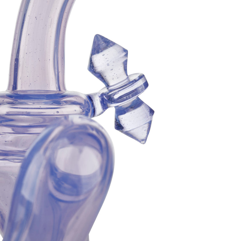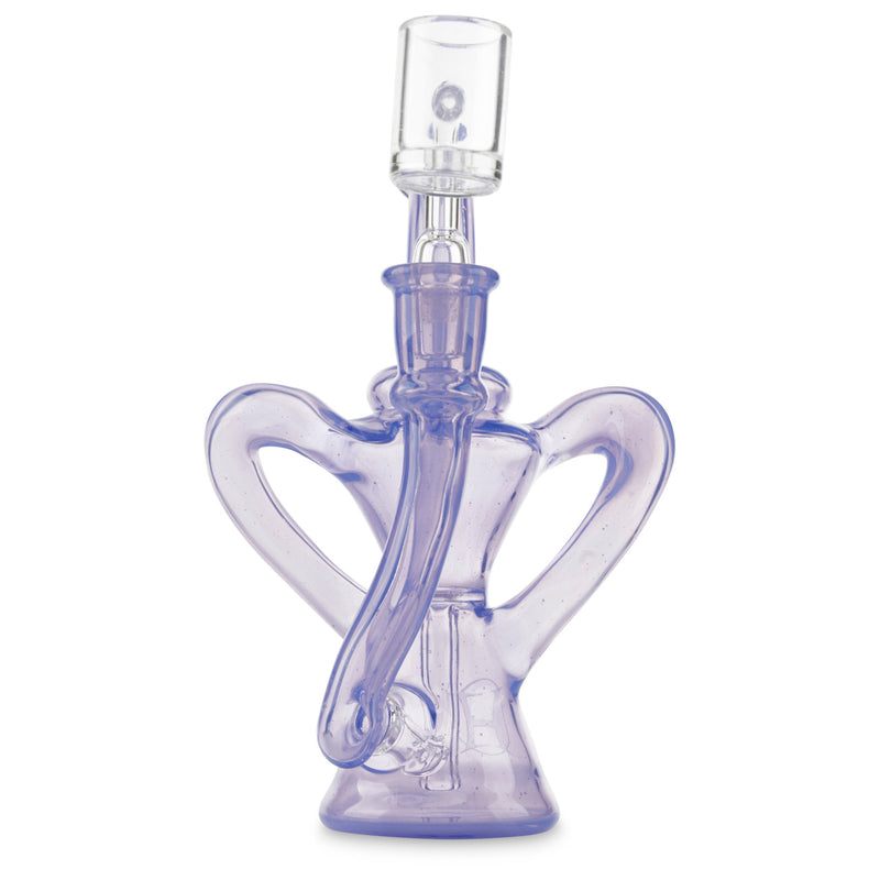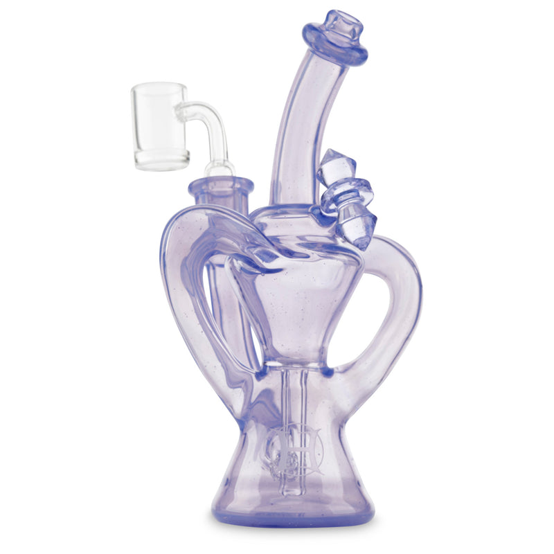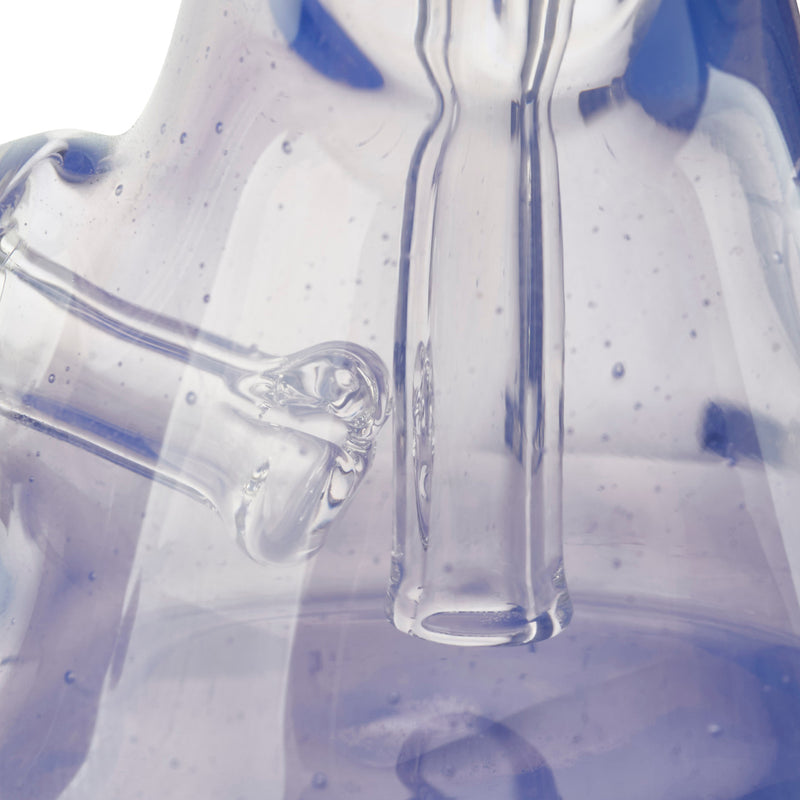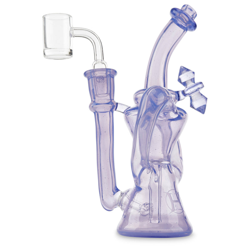Huffy Glass has been creating amazing glass recyclers for over 20 years. The founder of Huffy Glass, Ryan Hoffman, utilizes ancient venetian methods he learned while at the Penland School of Craft near Asheville, NC. This beautiful trophy recycler is designed with purple lollipop glass. This recycler is a dual uptake trophy with a fixed diffused downstem and stands at approx. 7.5" tall.