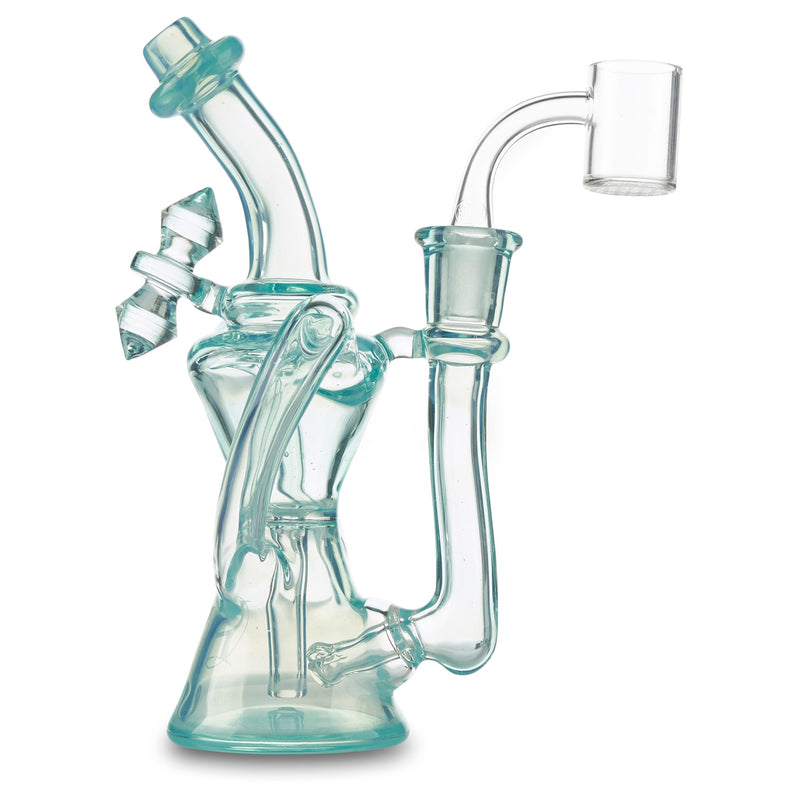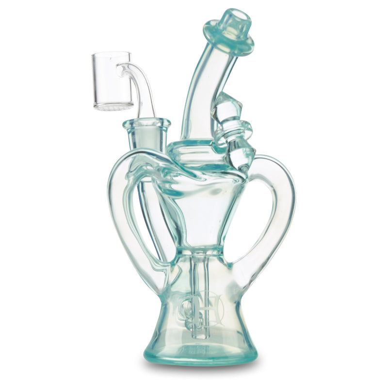 Ryan Hoffman AKA (huffy Glass) started melting glass in Evansville, Indiana in 1998. Originally mentoring under Dene Stephens, huffy honed in on his new craft. After a few years behind the torch huffy took his skills a step further by attending Penland school of crafts near Asheville, NC during the years (2001-2003). Not only attending as a student but also as an assistant instructor to his superiors. During that time exploring different glass melting techniques such as Venetian Craft, Neon Glass and Lathe work methods. Combining all those skills over the next decade Ryan started assembling his own designs and combinations of all the different techniques he had learned over the years. All this leading up to 2011 when Ryan put all his effort and time into opening Volta Glass Studio. To whom he has been the sole proprietor since 2012. This meta - terrania dual trophy recycler is one of Ryan's signature styles, with the dual uptake resembling a trophy. It has a 14mm female joint along with sculpted diamond shapes on the back of the piece which you will find on several of his designs.