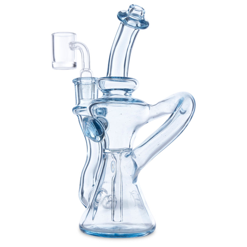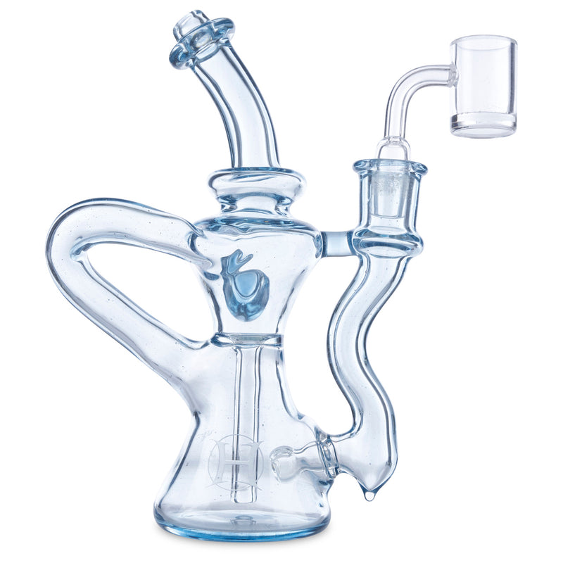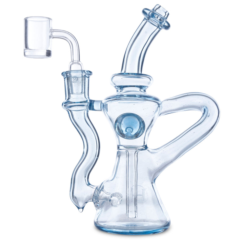 Huffy Glass's founding father is Ryan Hoffman. Ryan Hoffman has been producing pipes for more than sixteen years and was one of the first pioneers in the glass art industry. In 2010 Ryan launched Volta Glass Studio to educate in his home state, Indiana. Huffy Glass is popular for creating his beautiful recyclers and impressive scientific glass. This beautiful single arm trophy recycler is designed with aqua azul glass and features a 14mm female joint.