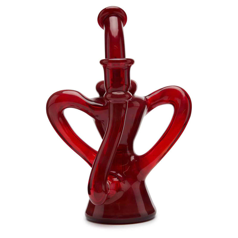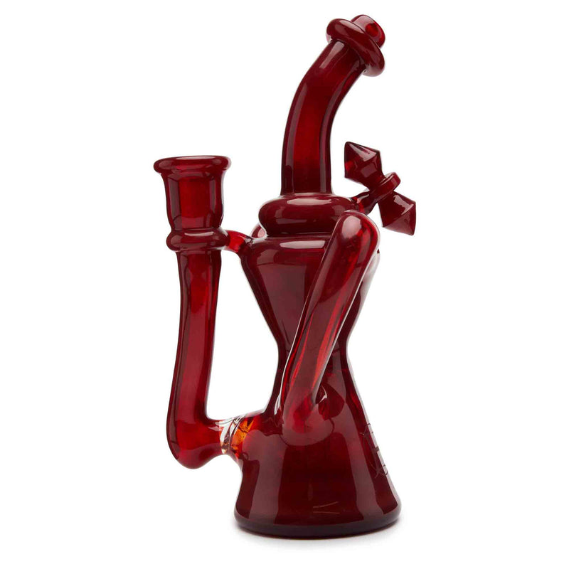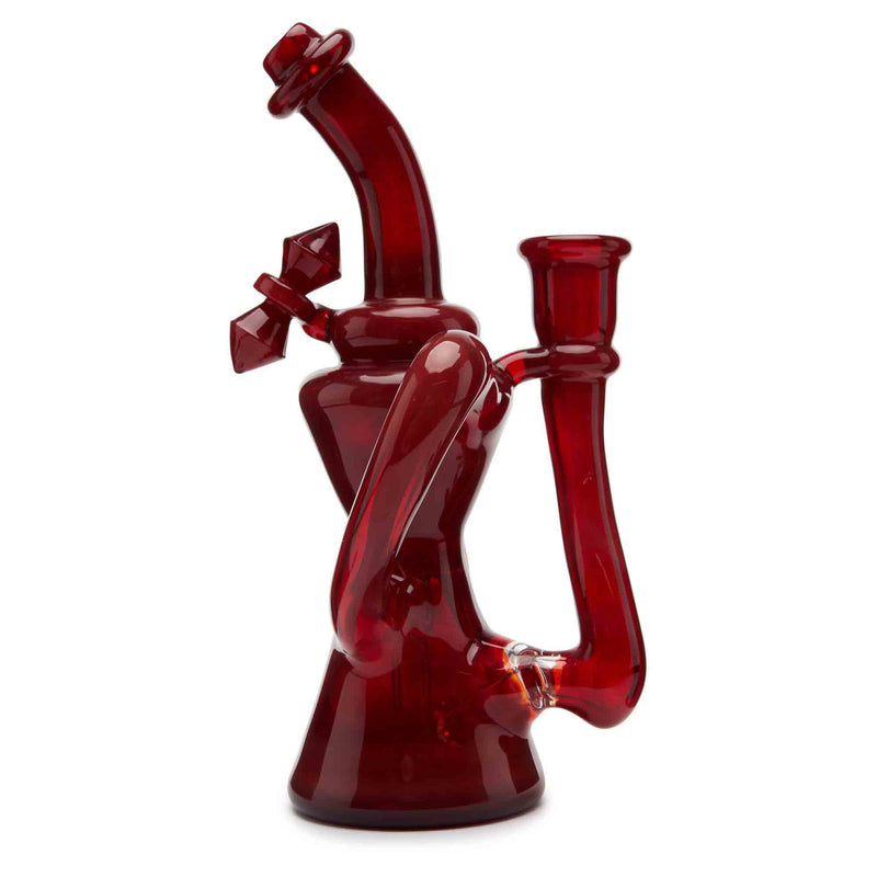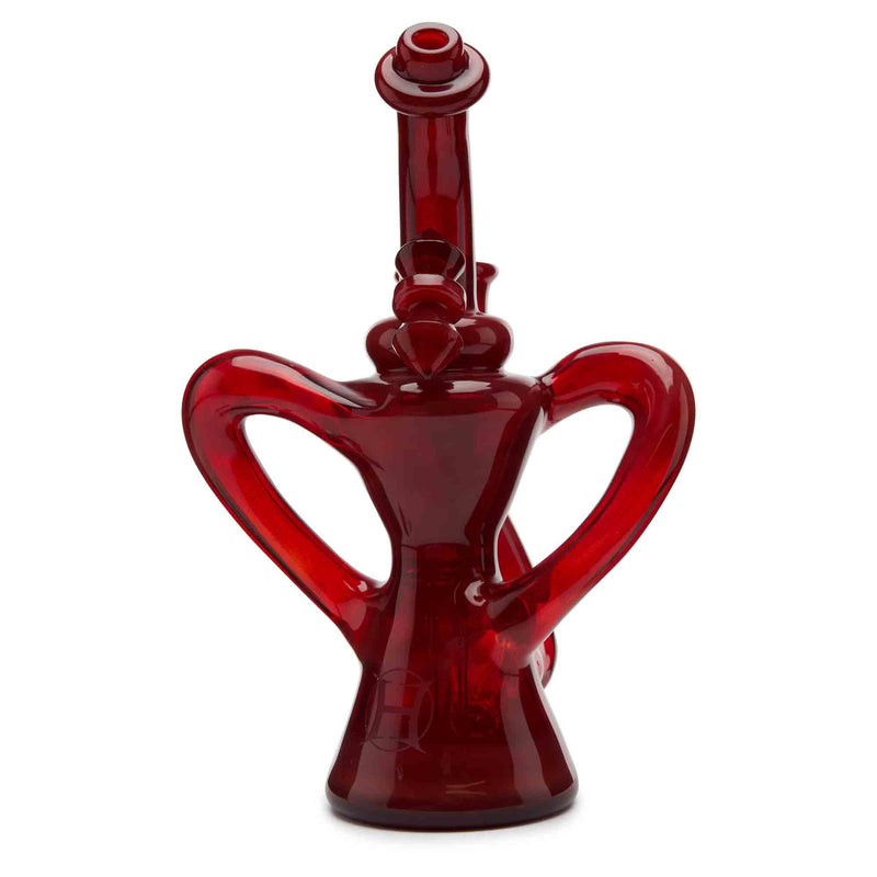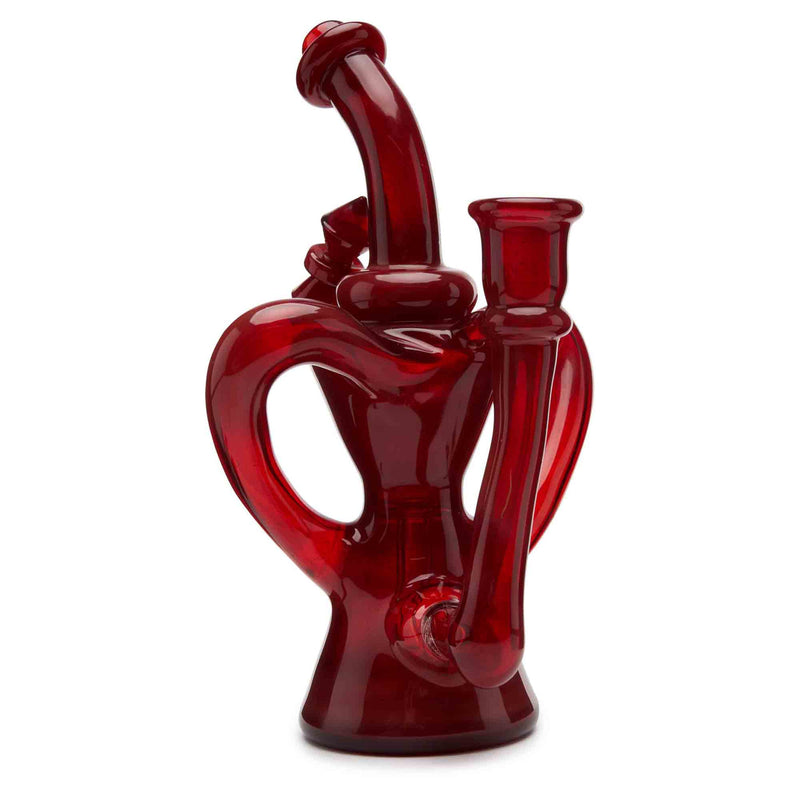 Ryan Hoffman aka Huffy Glass has been manufacturing lovely borosilicate glass designs for more than two decades. Combining 8th century Venetian methods with fresh concepts and thoughts discovered at the Penland School of Craft near Asheville, NC, Huffy Glass is always producing beautiful and high-quality scientific glass designs. His glass recycler pieces are extremely popular with his single and dual arm uptake designs. This single uptake recycler is a single arm trophy recycler made with pomegranate color glass. This beautiful recycler features a 14mm female joint.