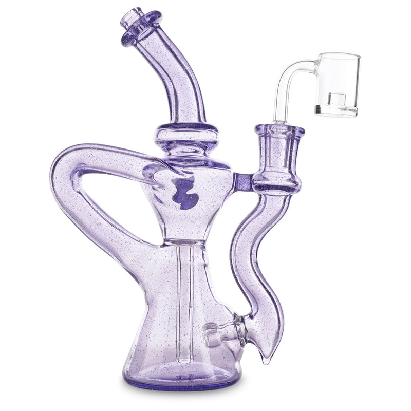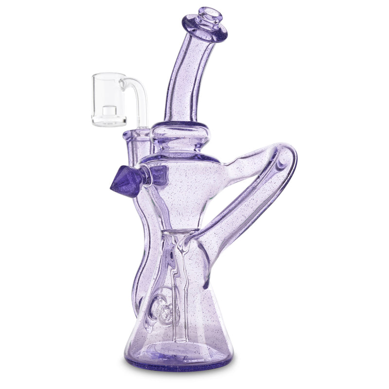 Ryan Hoffman aka Huffy Glass has been lampblowing for over sixteen years with pipes and was one of the first pioneers in the glass art movement. Ryan opened Volta Glass Studio in 2010 to teach and create awareness in his home state of Indiana. This beautiful trophy recycler by Huffy Glass is fully worked with purple lollipop glass. The side of the piece features a signature Huffy diamond reinforced to the recycler. This recycler will provide amazing function giving you amazing smooth hits every sesh. This Huffy Trophy Recycler stands at approx. 8.25" tall.