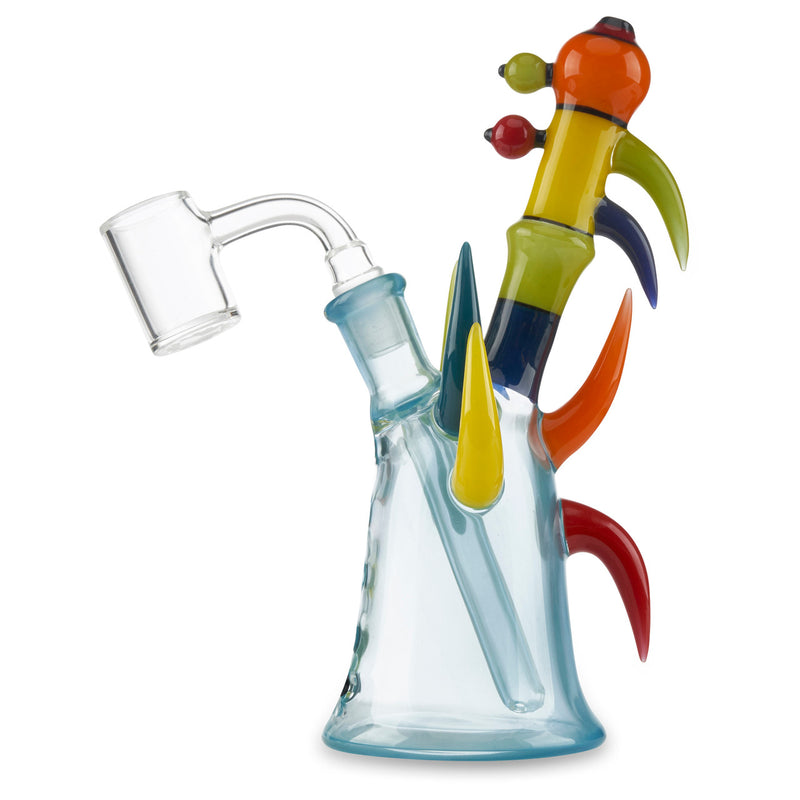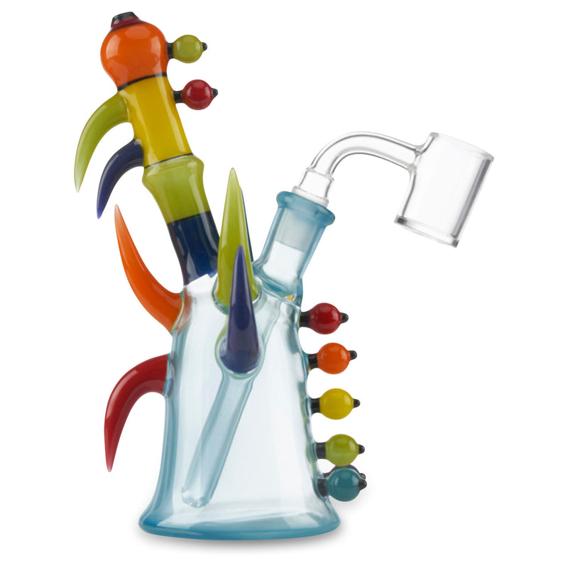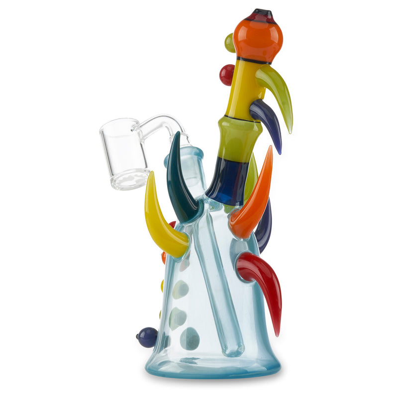 Inkz Glass is always producing unique and colorful custom glass pieces. The Inkz Mini Tube collab with @alejandroglass features a baby blue base with a cadmium rainbow mouthpiece stemming out from the pipe. Additionally, this mini tube has unique solid color glass claws and bubbles coming out of the pipe that makes this piece stand out as well as provides extra grip for a more comfortable hold. Amaze your friends with the beautiful heady Inkz Mini Tube Today!