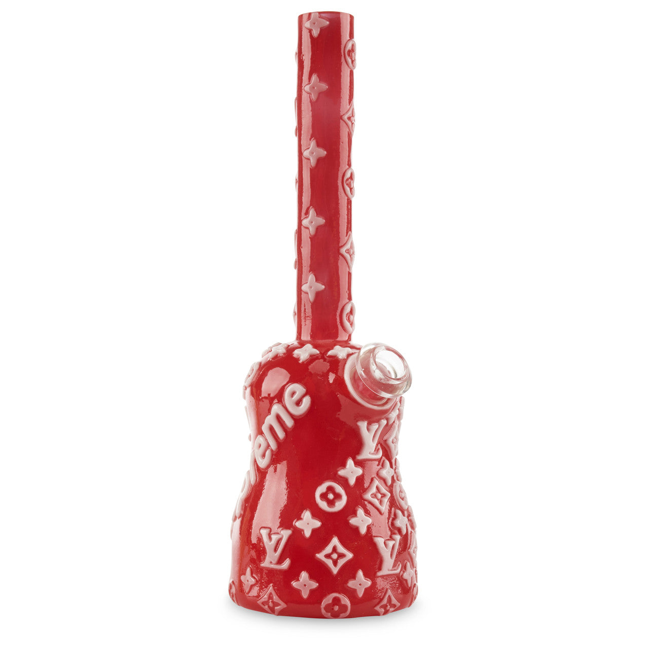 Add luxury to your glass collection with the LV x Supreme James Caribou Mini Tube. This beautiful mini tube features the popular LV x Supreme designer pattern throughout the piece. This piece was hand carved and crafted by glass artist James Caribou. James Caribou is an American artist who brings luxury to his glass pieces by featuring the world's top designer brands in his work. Get the James Caribou Mini Tube LV x Supreme today!