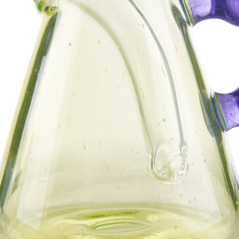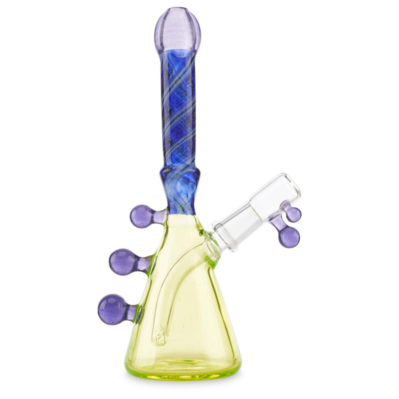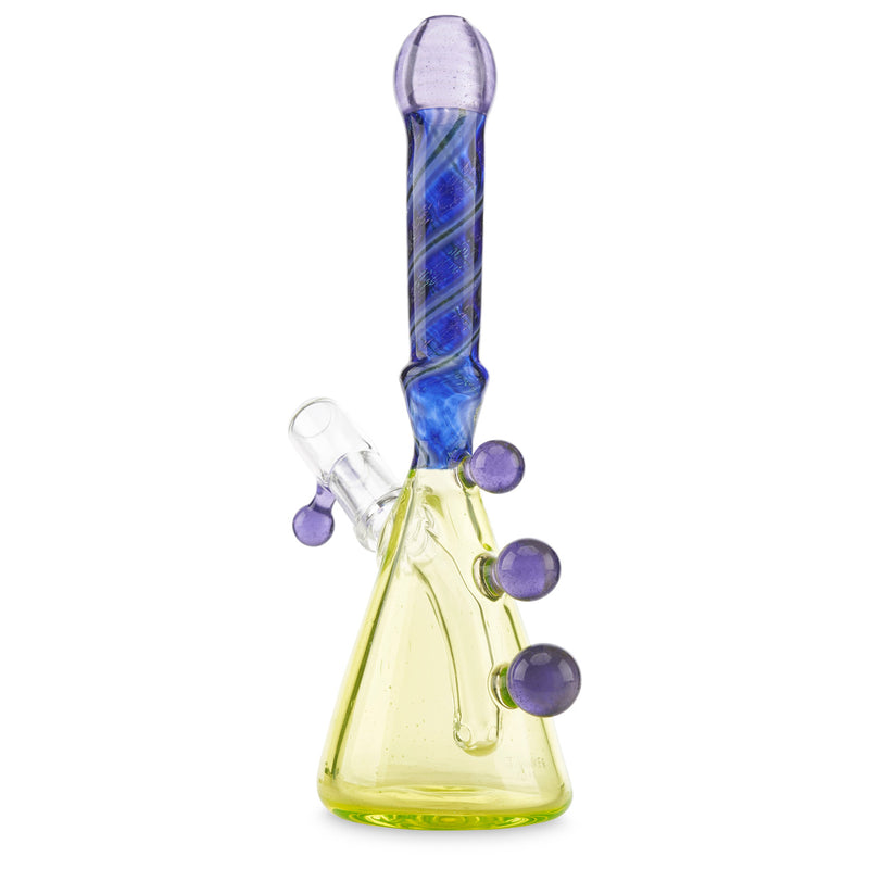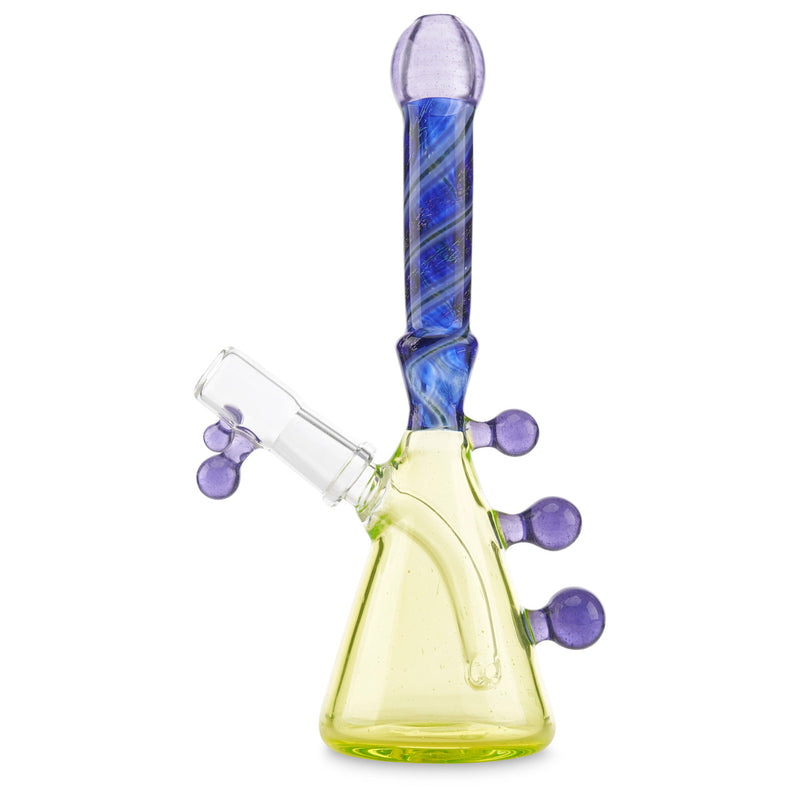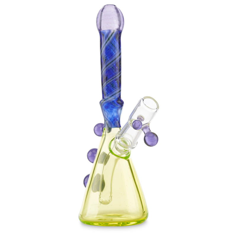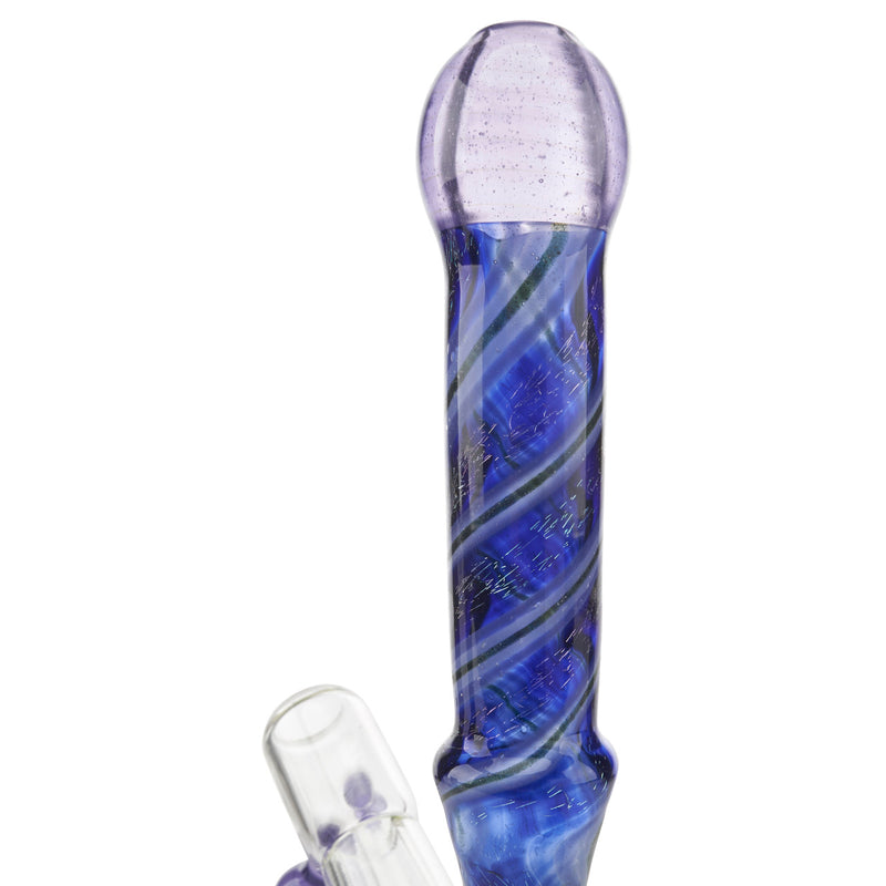 Jon E. Walker is an Illinois glass artist who has been making fantastic glass art for over a decade. This beautiful mini tube is designed with a dichro worked neck along with a slyme green base. The back of the mini tube features three purple marbles providing you with extra grip and a more sturdy hold. Additionally, this piece comes with a matching female slide. Get the mini tube today at Cloud 9 Smoke Co.!