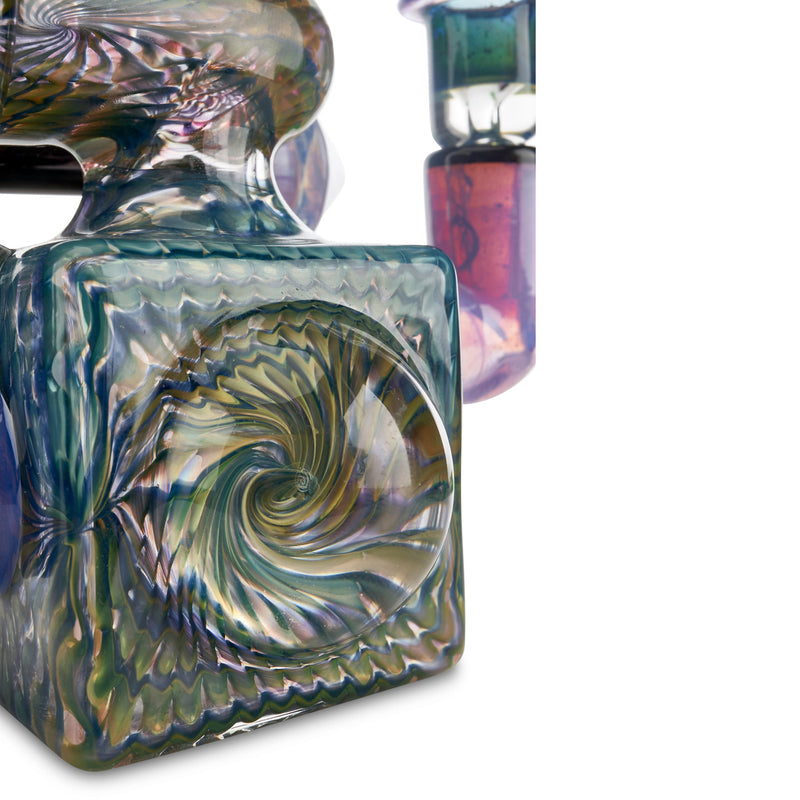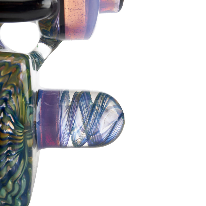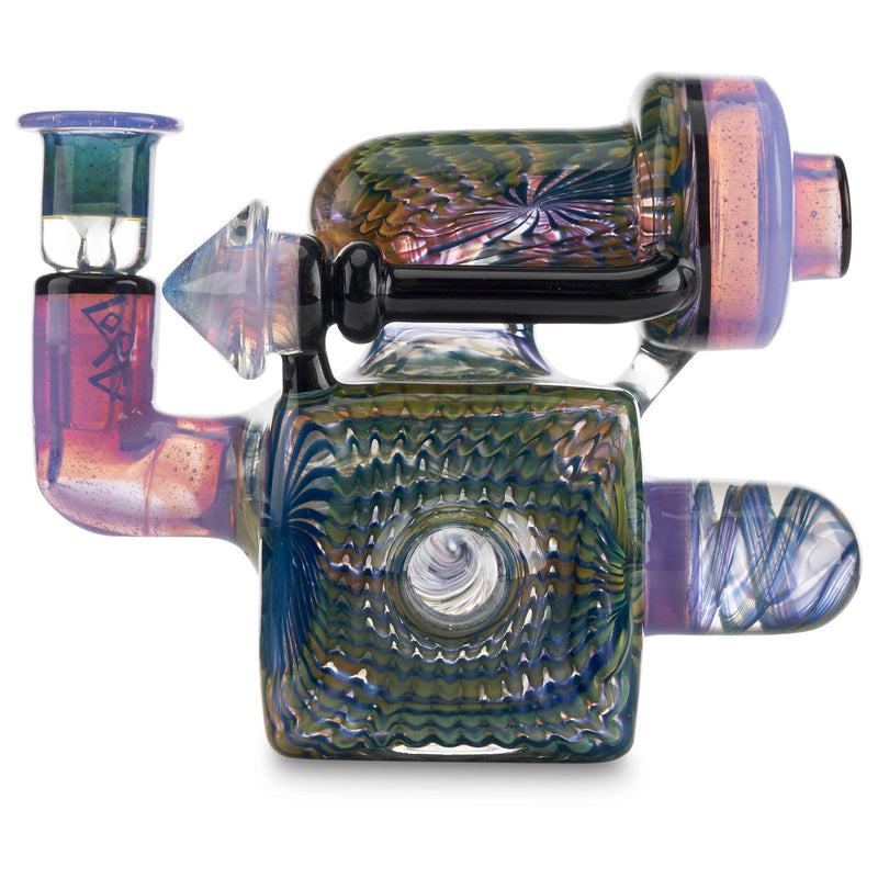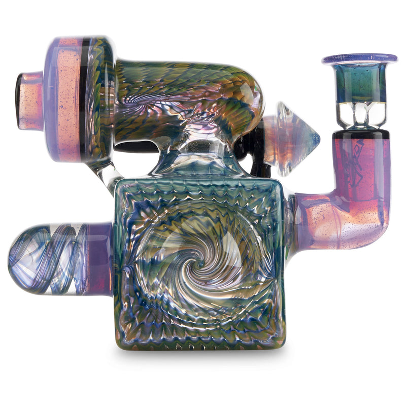 This incredible concentrate rig is a collaboration piece between Jsyn Lord x Dosh World. Jsyn Lord truly has one of the most unique styles seen currently in the world of pipe art. His forms have an almost mechanical appearance to them, and the many details, reminiscent of heavy machinery, create an interesting and visually-appealing pipe that is quite unlike anything else out there. Dosh World's cut and flip technique is second to none: it is clear from his work that he has a mastery of controlling colored boro in the flame. Combine those two amazing skills, and the result is a piece of art unlike any other.